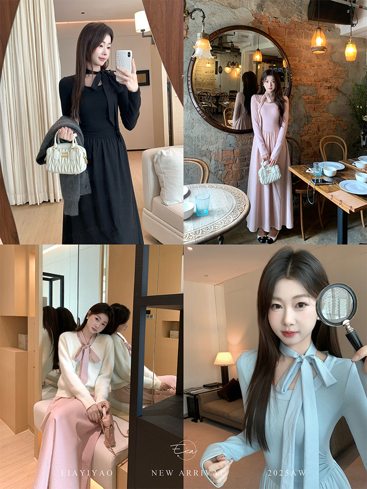 FA43651# 温柔风蝴蝶结挂脖露背连衣裙女秋季新款收腰显瘦减龄A字长裙 服裝批發女裝批發服飾貨源
