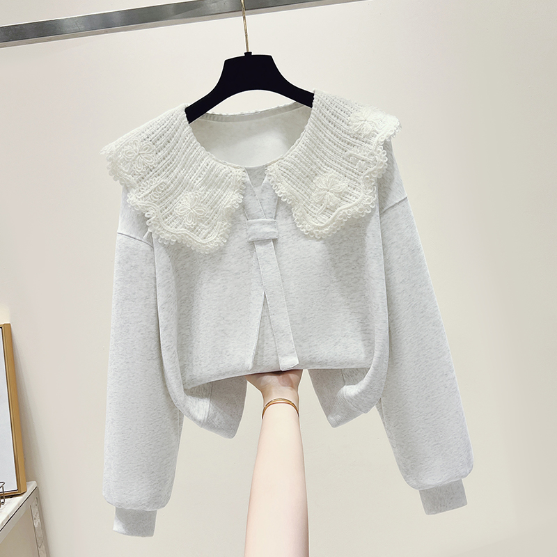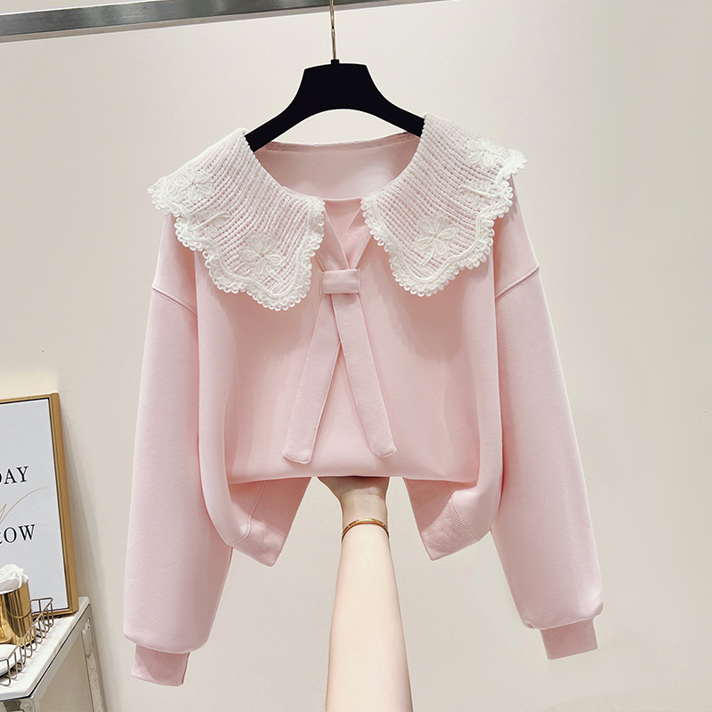 FA43704# 思洛伊早春新款勾花娃娃领甜美学院风卫衣 服裝批發女裝批發服飾貨源
