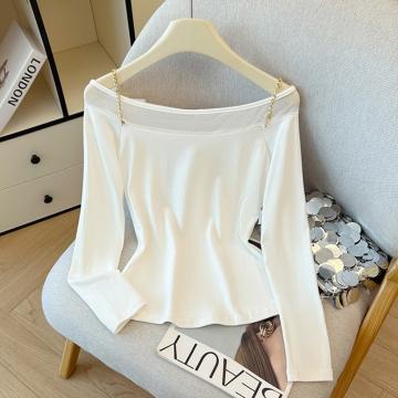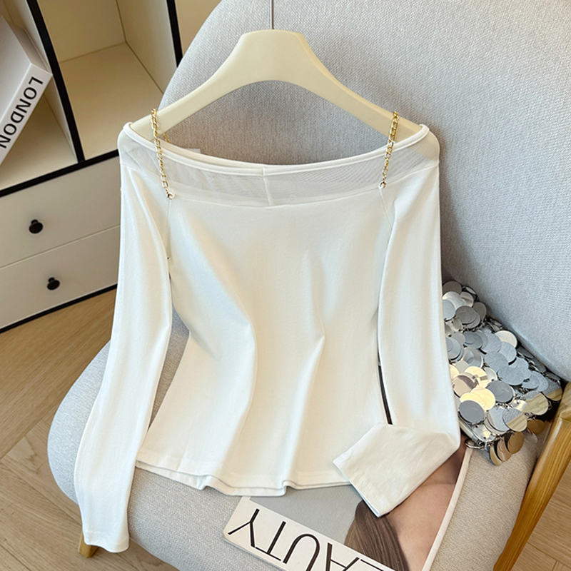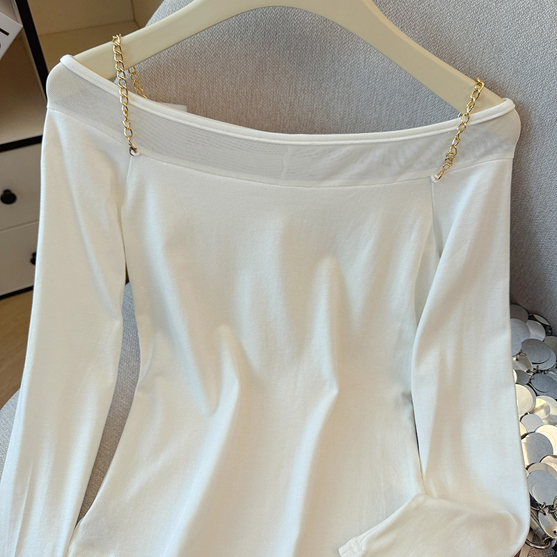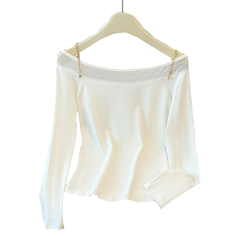 FA43783# 秋冬别致辣妹修身长袖网纱一字肩打底衫女设计感绝美上衣 服裝批發女裝批發服飾貨源