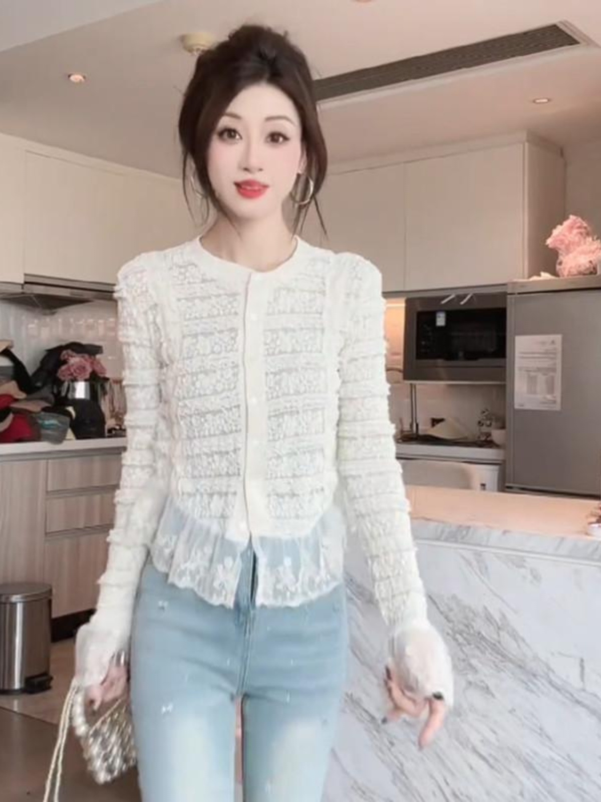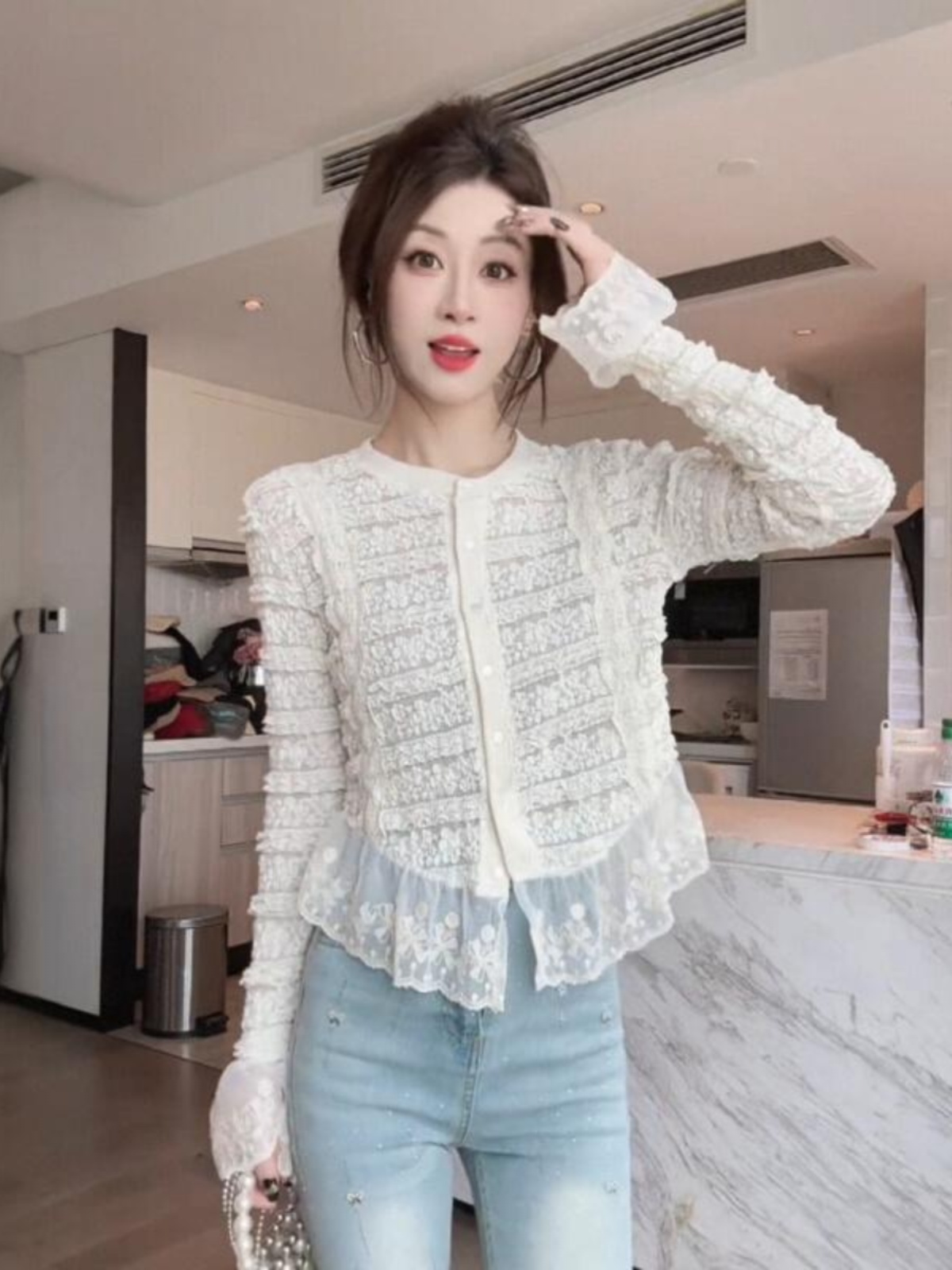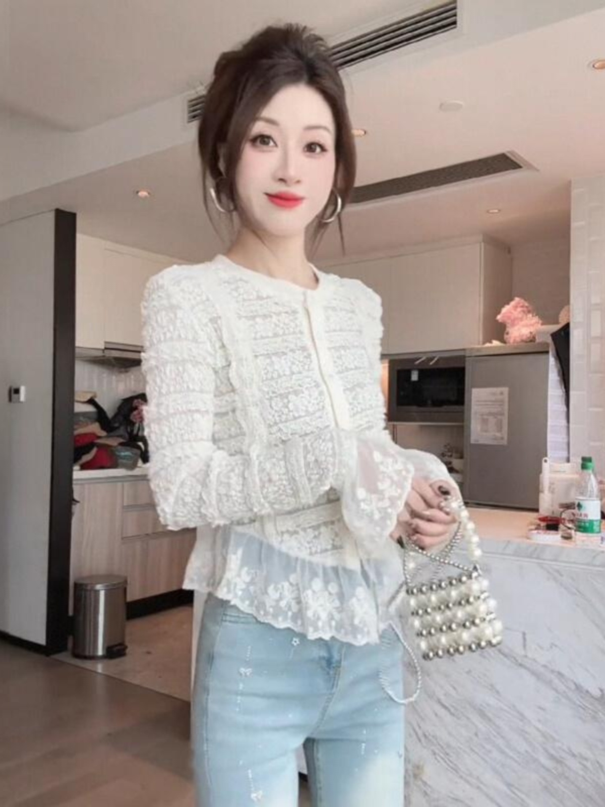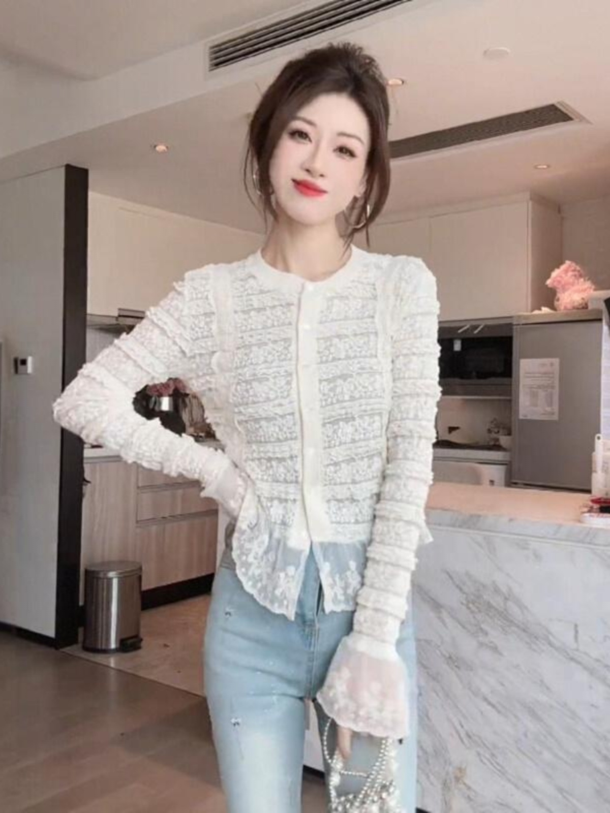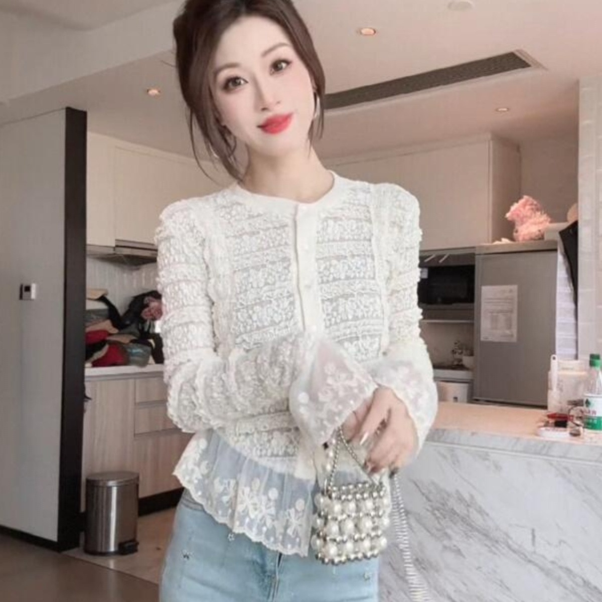 FA43883# 早秋法式设计感小众蕾丝拼接喇叭袖气质修身绝美小衫女 服裝批發女裝批發服飾貨源
