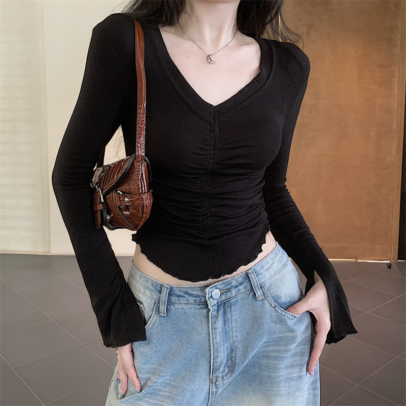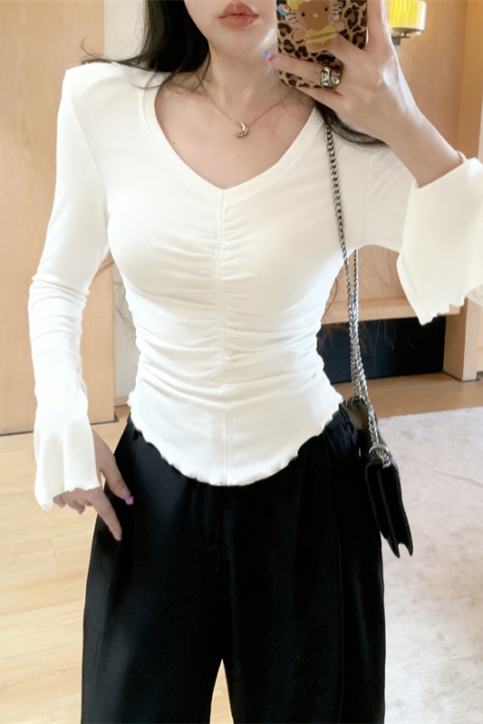 FA43956# 心型v领显瘦褶皱开叉设计长袖T恤女 服裝批發女裝批發服飾貨源