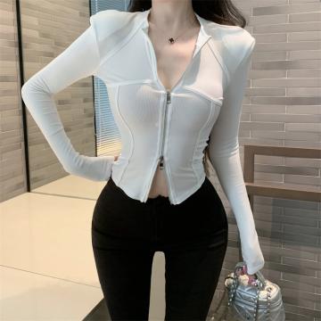 FA43959# 美式辣妹小众双拉链长袖开衫外套女秋季新款修身显瘦短款上衣 服裝批發女裝批發服飾貨源