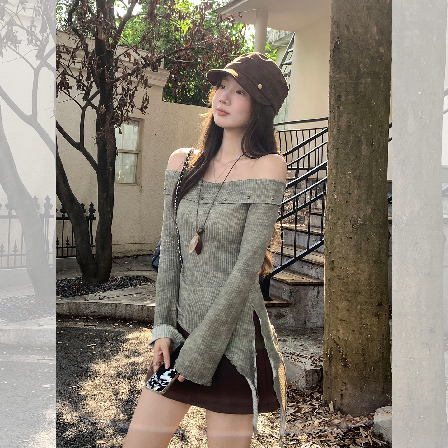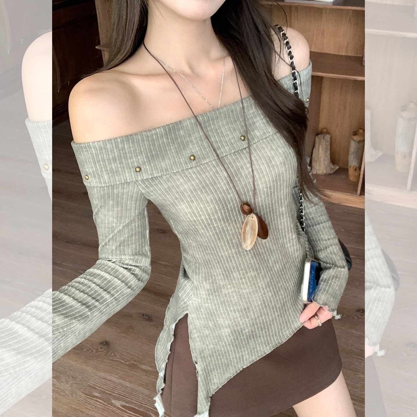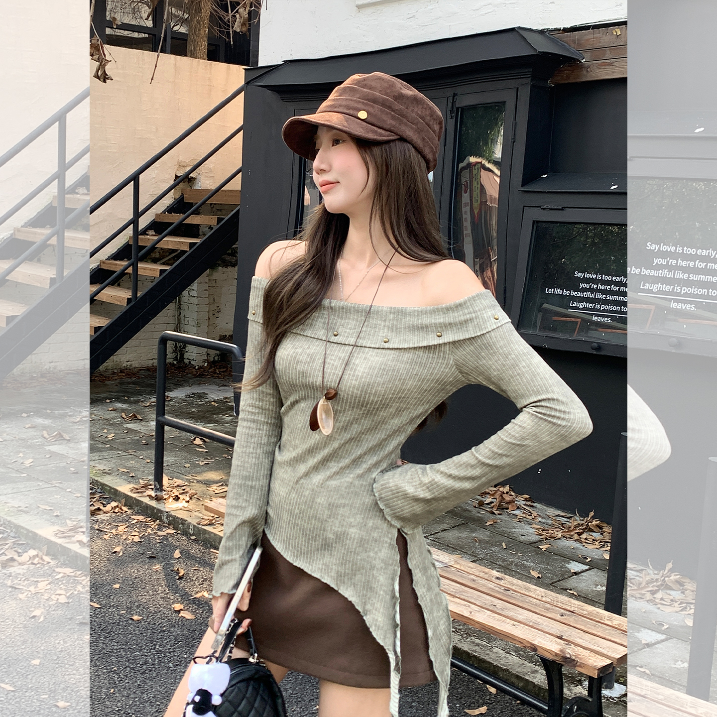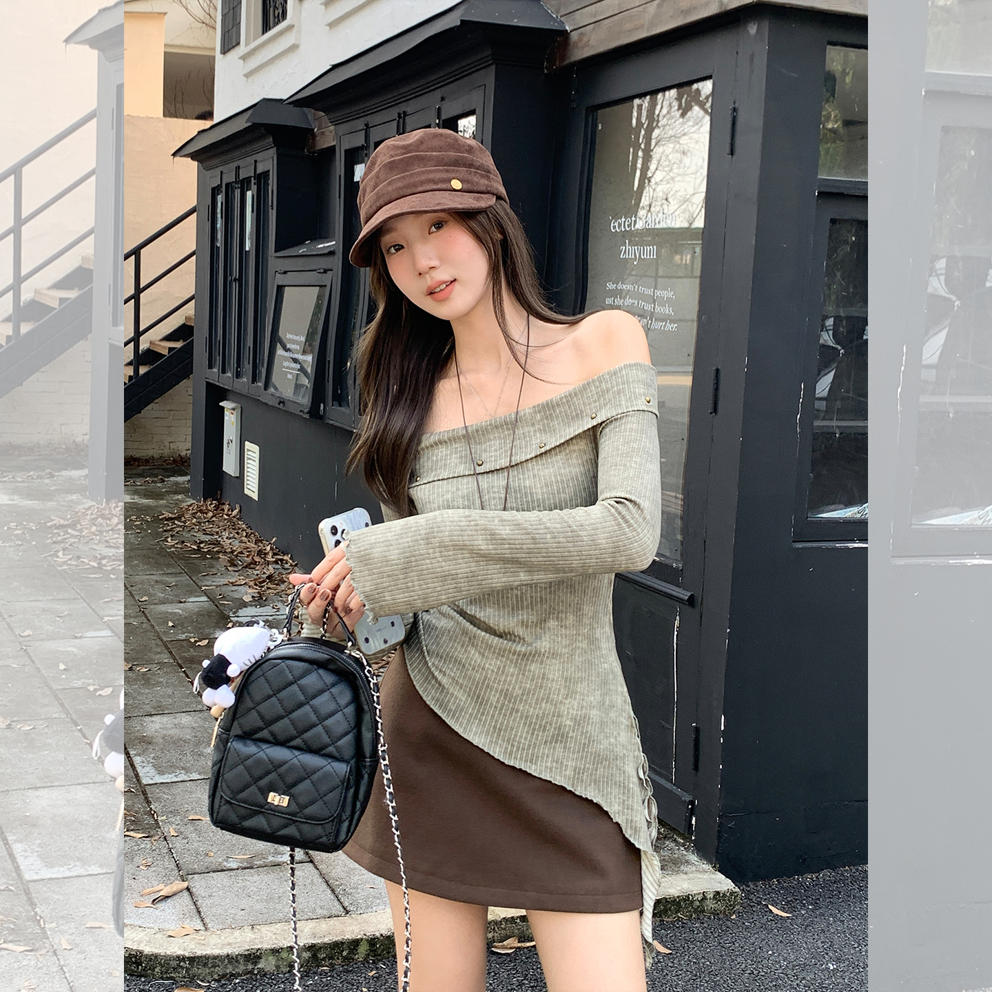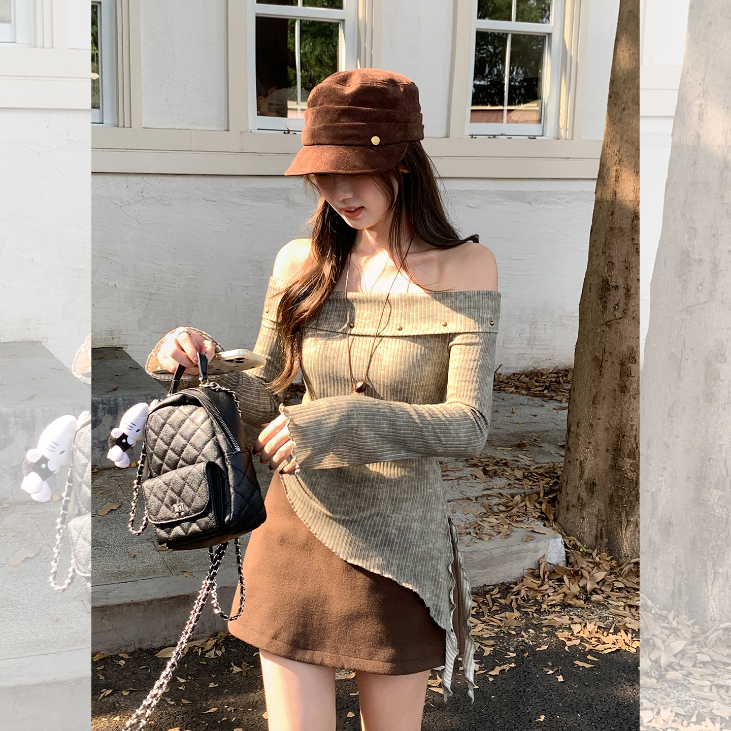 FA44007# 小众纯欲一字肩不规则下摆长袖T恤女秋洋气修身显瘦上衣 服裝批發女裝批發服飾貨源