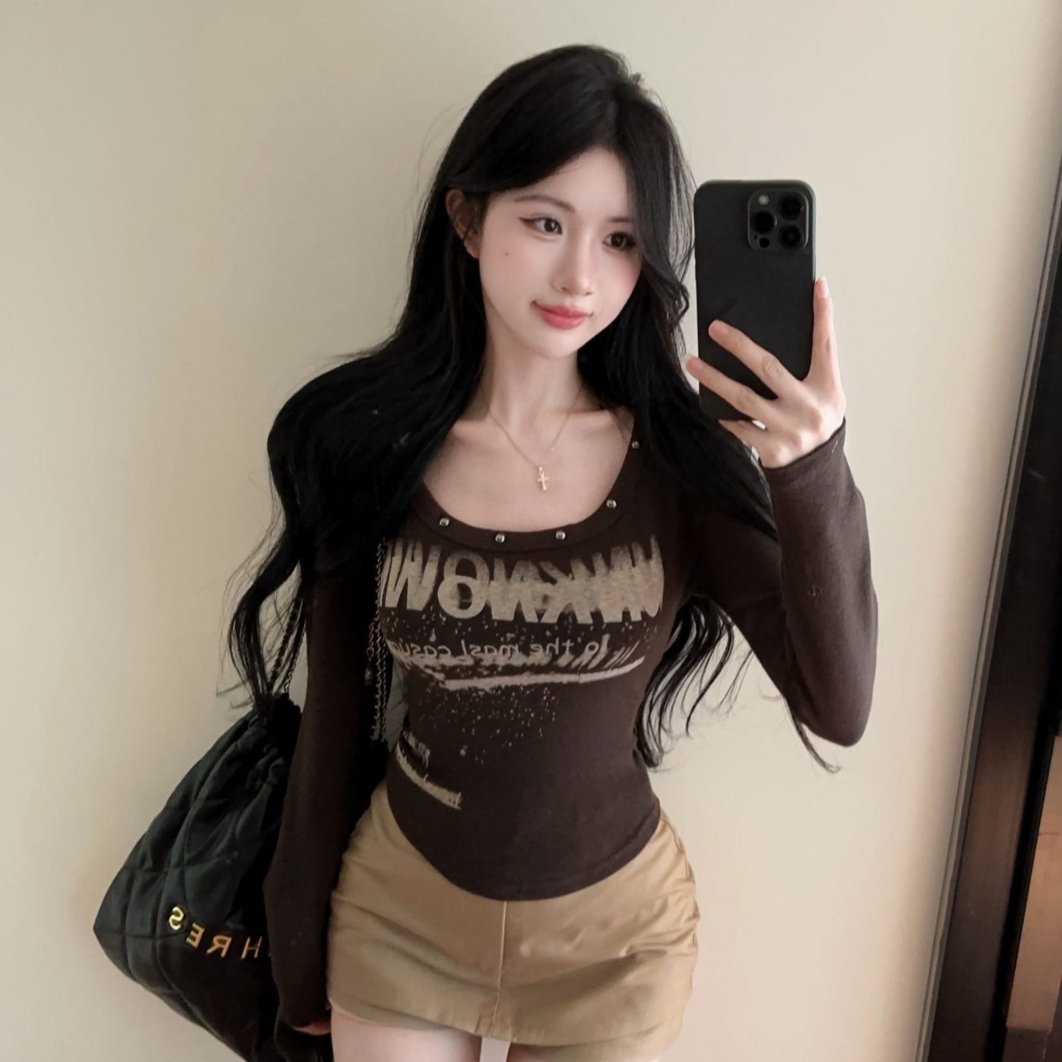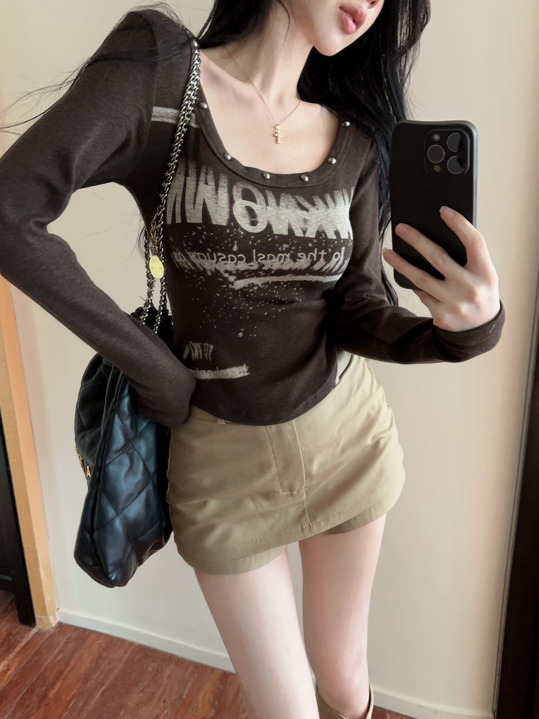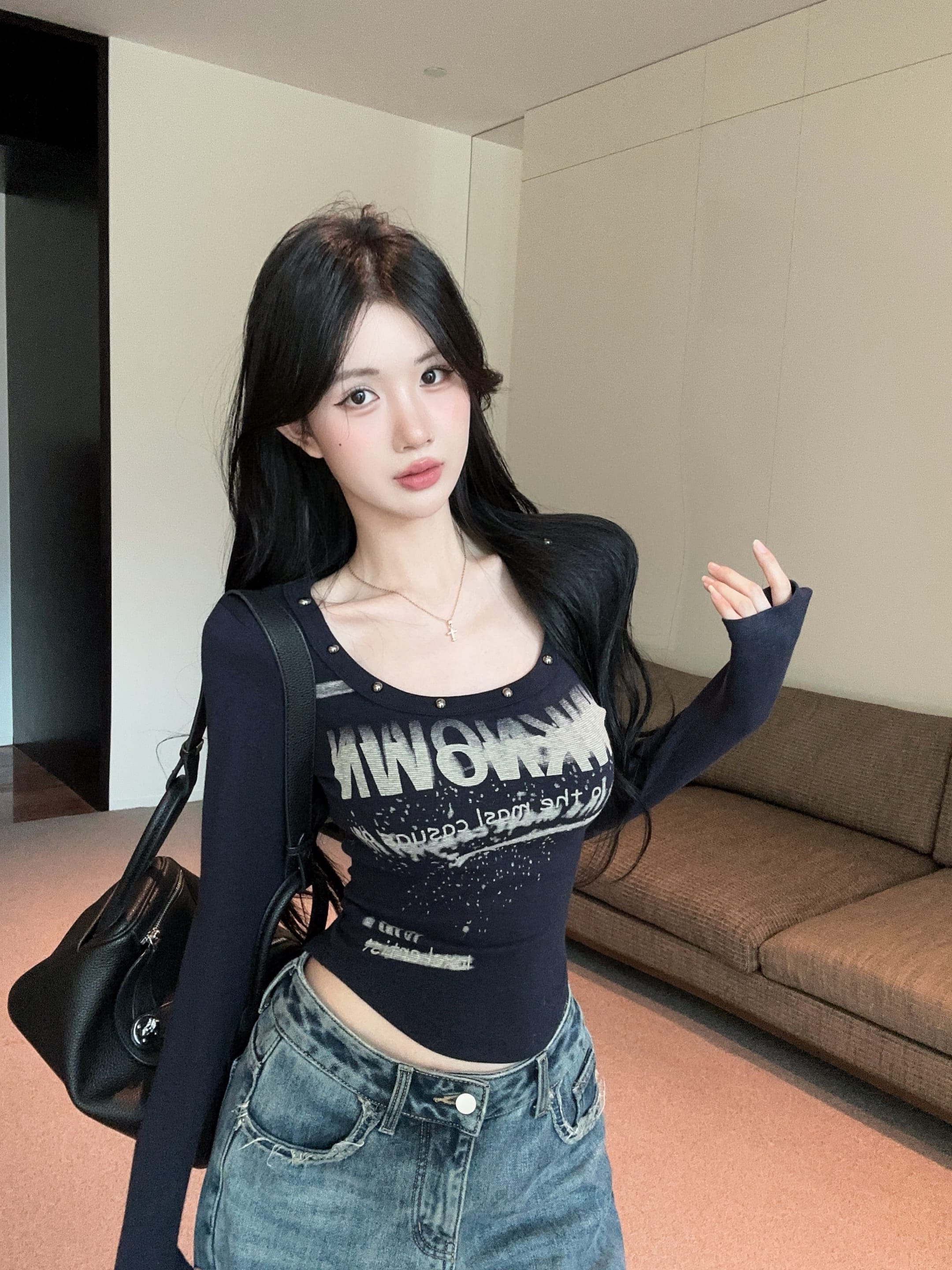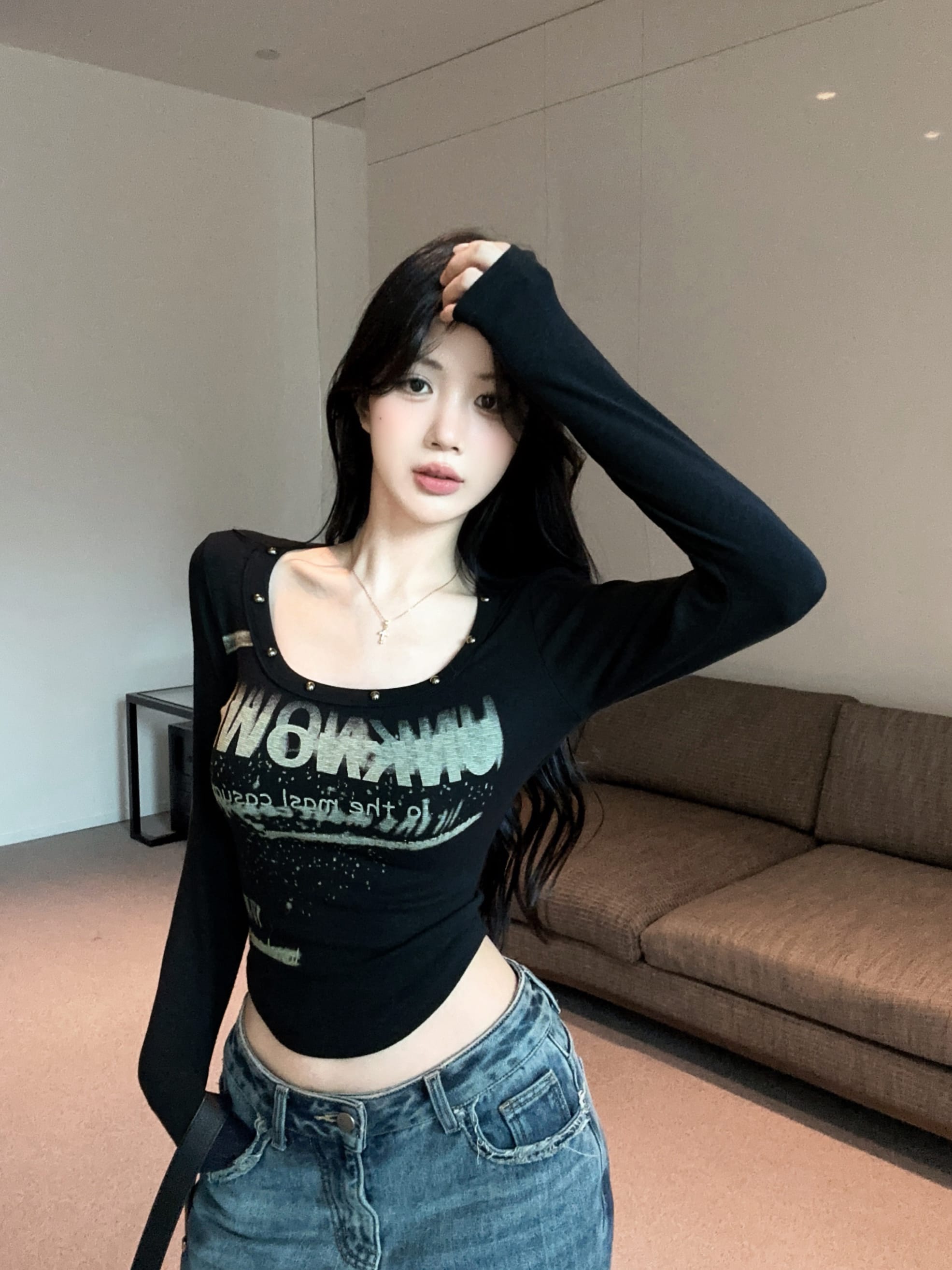 FA44025# 辣妹设计感铆钉字母印花U领长袖T恤百搭性感打底衫上衣 服裝批發女裝批發服飾貨源