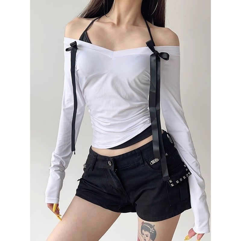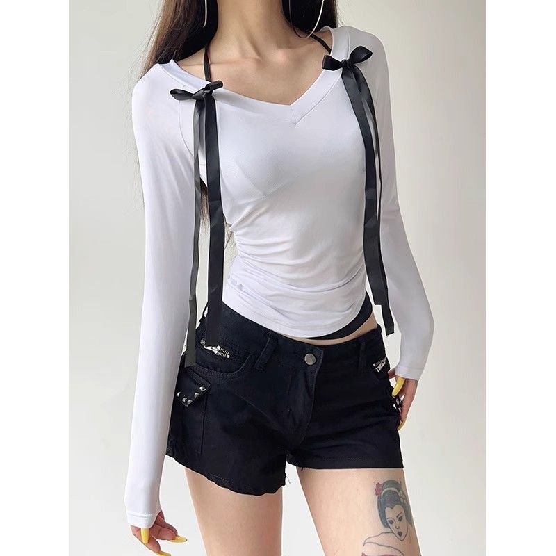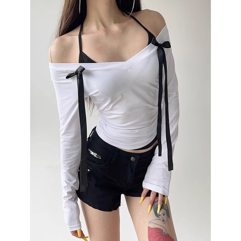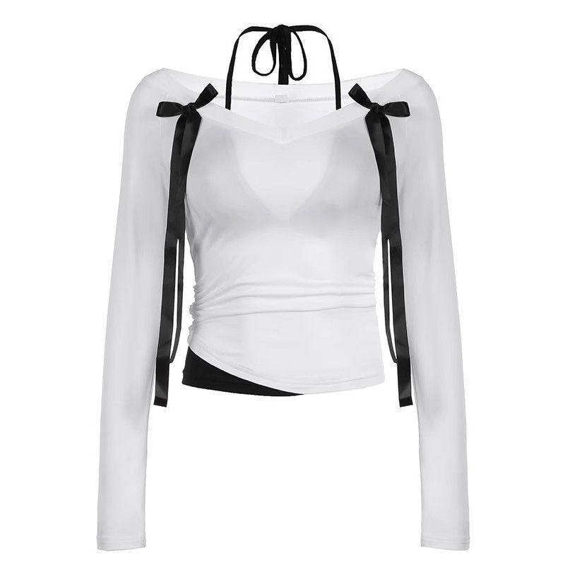 FA44048# 蝴蝶结挂脖假两件拼接V领长袖T恤打底衫上衣 服裝批發女裝批發服飾貨源