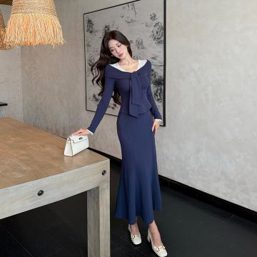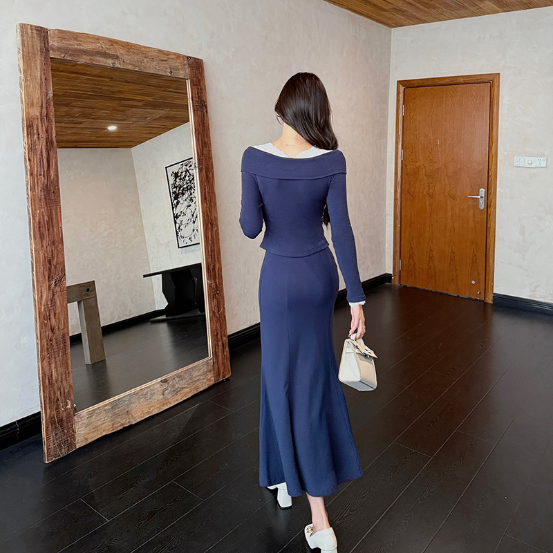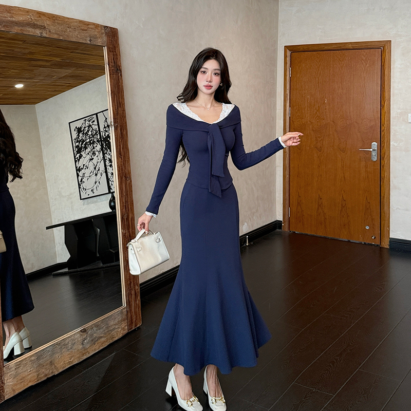 FA44334# 松间语法式蕾丝拼接上衣女秋季高腰鱼尾半身裙长袖针织套装 服裝批發女裝批發服飾貨源