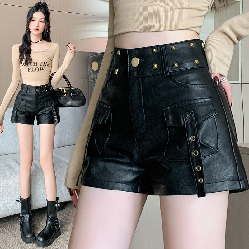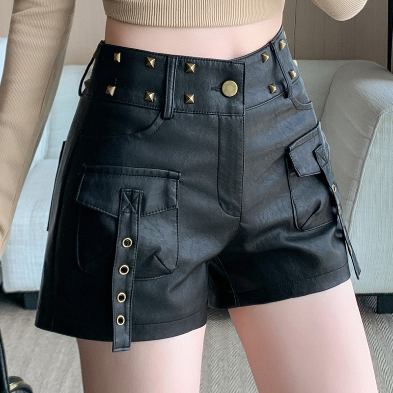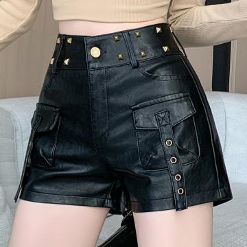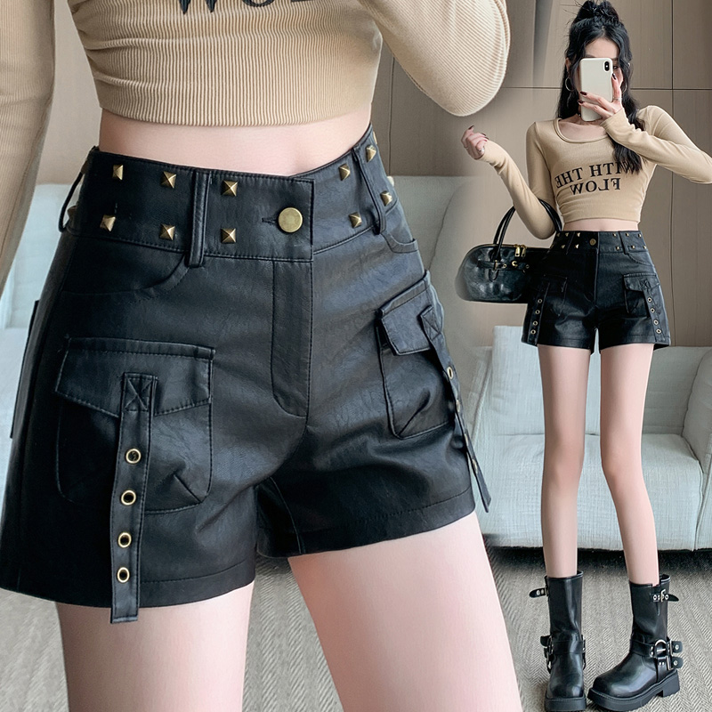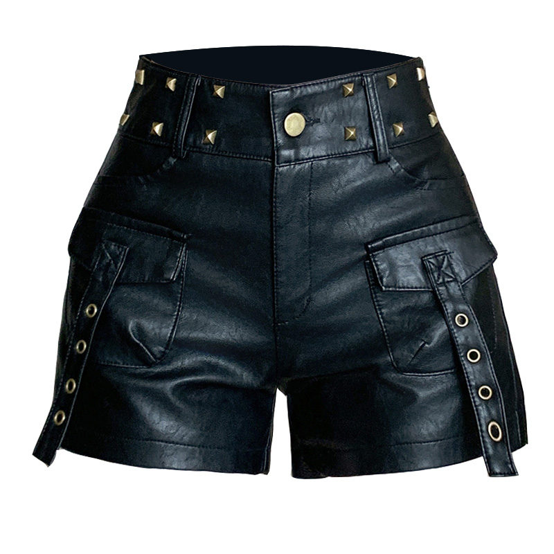 FA44551# 朋克风时髦热裤好质量洗水PU皮短裤辣妹铆钉包臀修身短靴库 服裝批發女裝批發服飾貨源