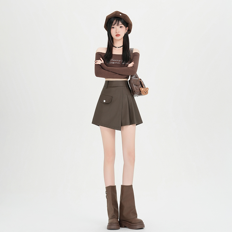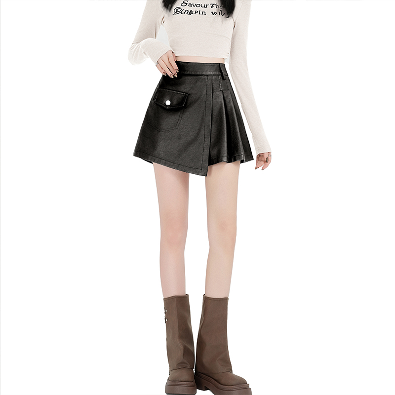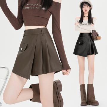 FA44925# 洗水PU皮咖色A字百褶辣妹短裙秋冬百搭显瘦半身裙短裤裙女 服裝批發女裝批發服飾貨源