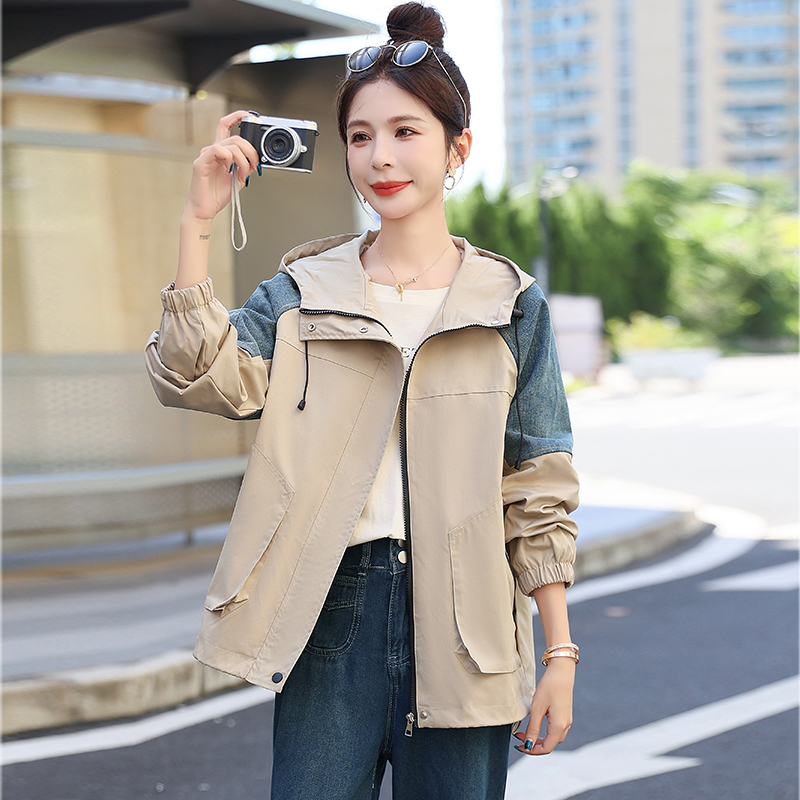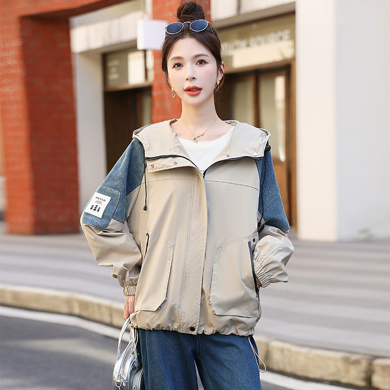 FA44943# 新款穿搭时尚减龄小众设计感牛仔拼接连帽外套夹克女 服裝批發女裝批發服飾貨源