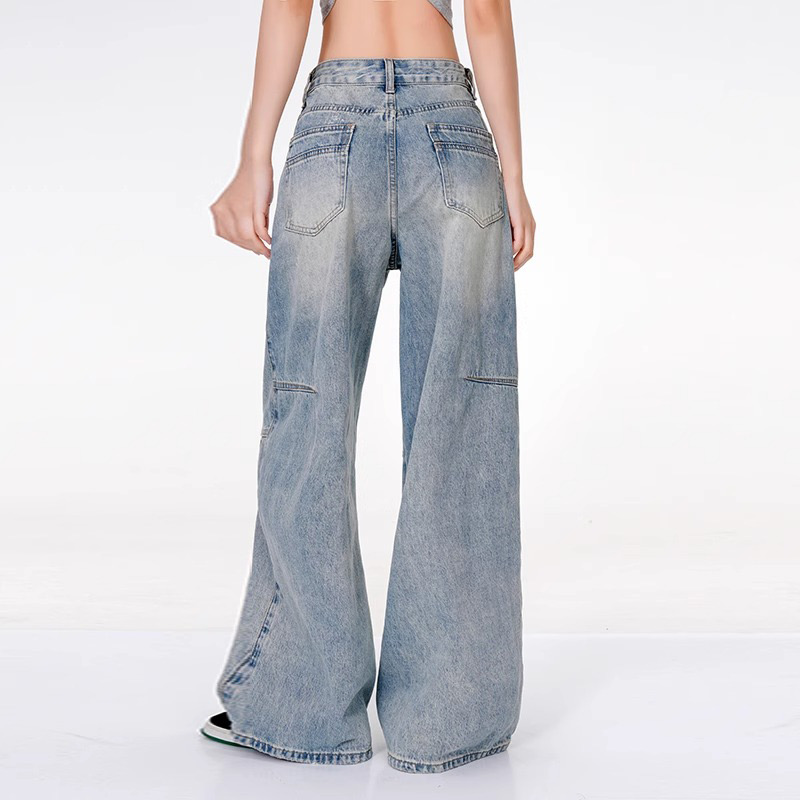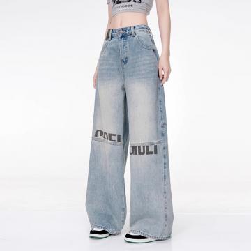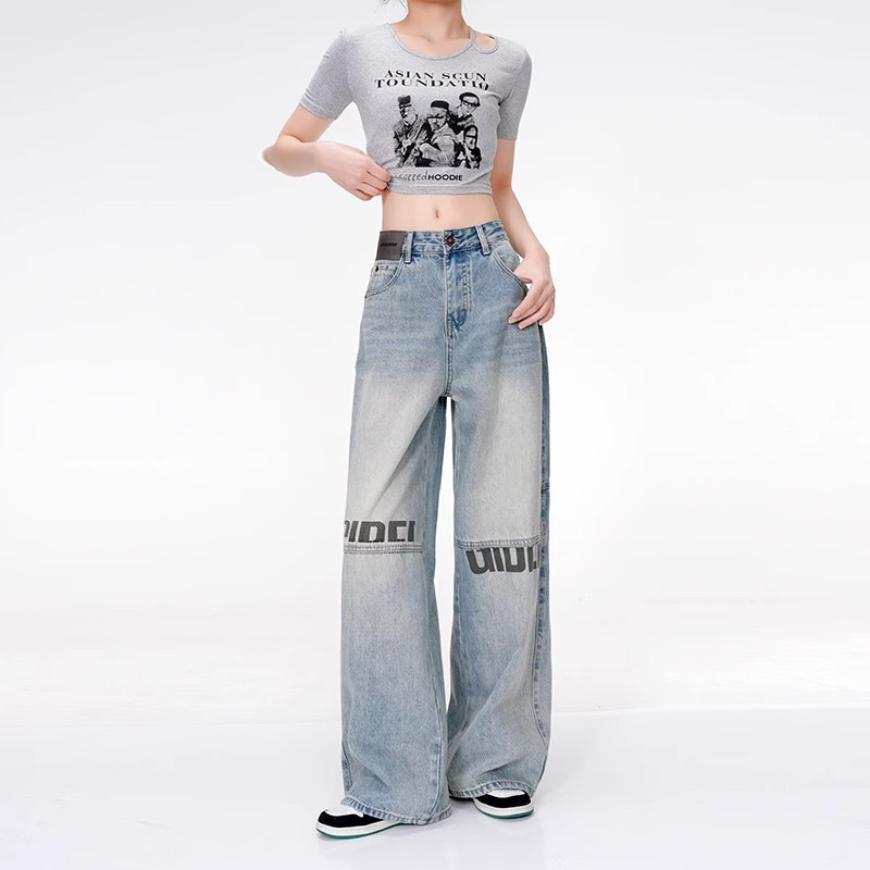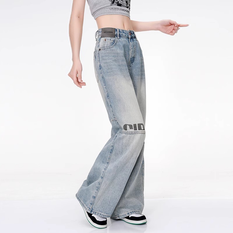 FA45050# 美式复古阔腿牛仔裤女秋季新款遮跨字母印花设计感拖地裤宽松裤子 服裝批發女裝批發服飾貨源