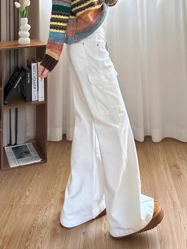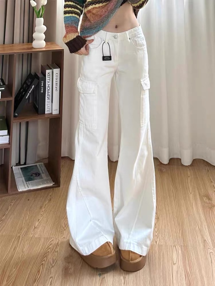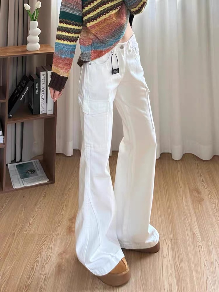FA45052# 美式复古白色微喇工装牛仔裤女秋季新款多口袋喇叭拖地长裤子 服裝批發女裝批發服飾貨源