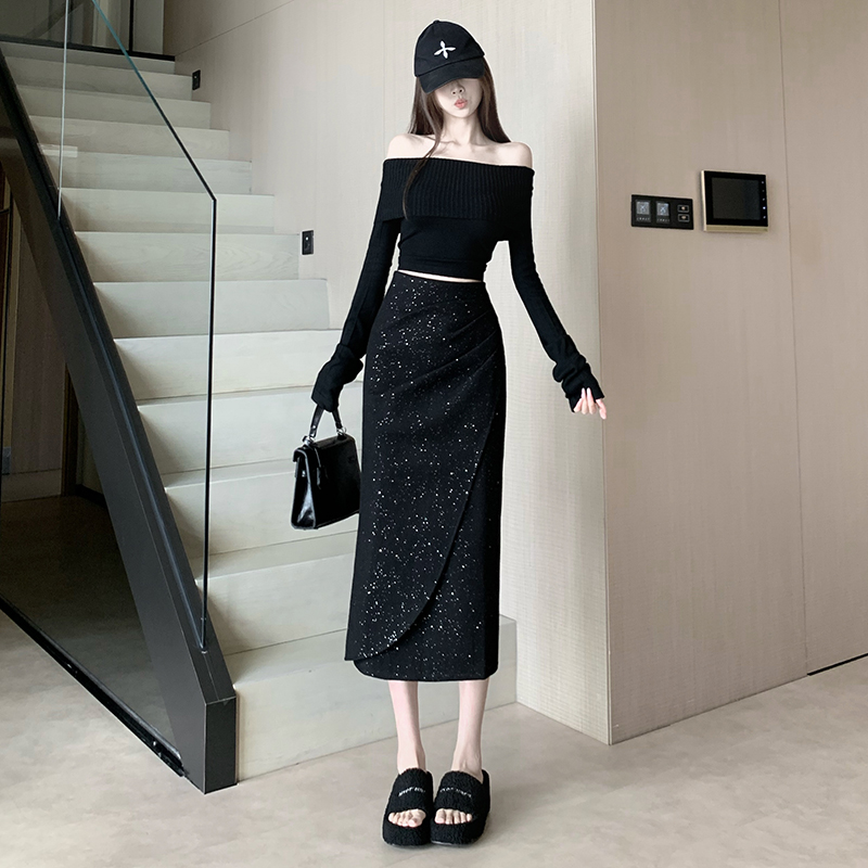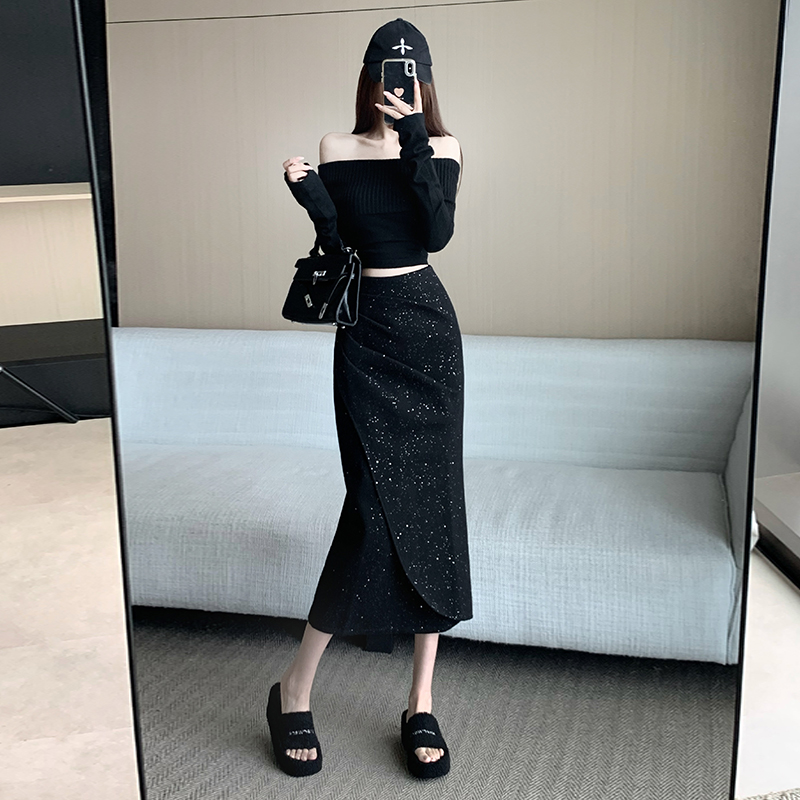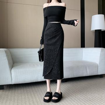 FA45105# 韩版简约高腰细闪拼接亮片精致显瘦时尚包臀柔软呢子半身裙女 服裝批發女裝批發服飾貨源