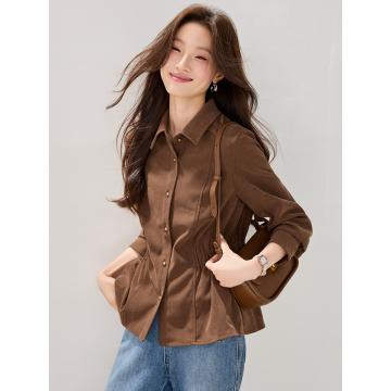 FA45382# 秋冬新款磨毛肌理感简约百搭上衣时尚显瘦翻领收腰衬衫女 服裝批發女裝批發服飾貨源