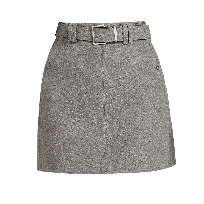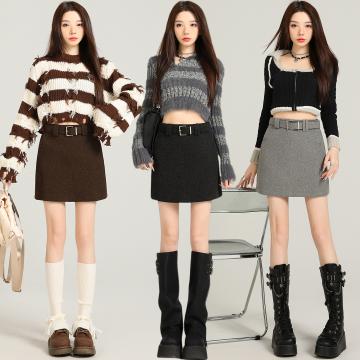 FA46128# 秋冬百搭灰色毛呢半身裙女新款高腰显瘦磨毛西装a字短裙配腰带 服裝批發女裝批發服飾貨源