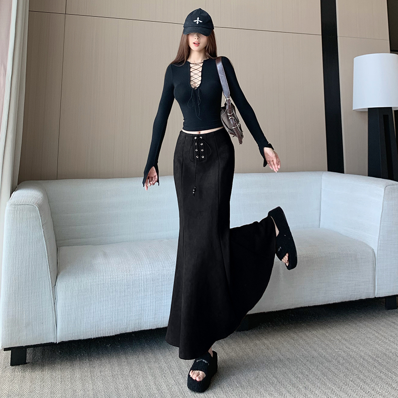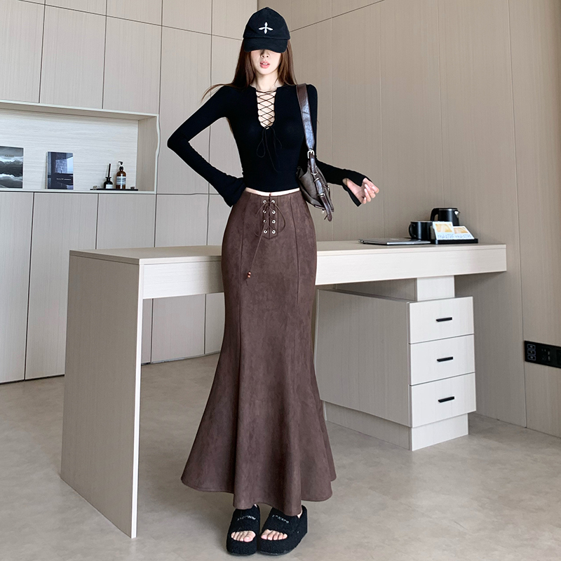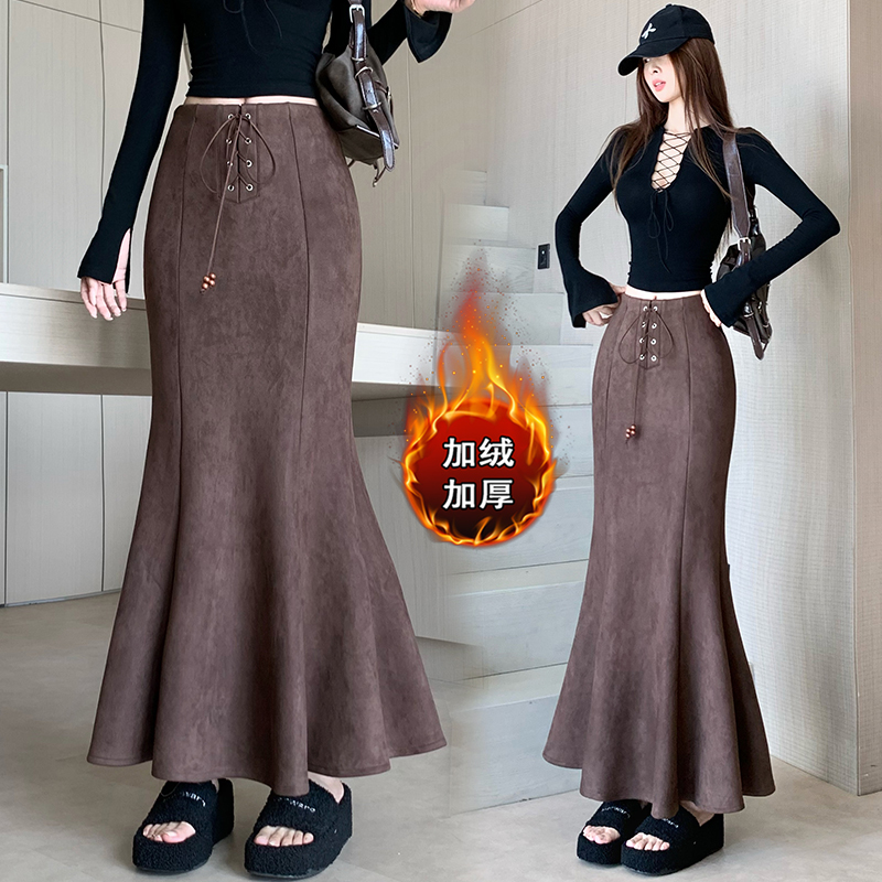 FA46869# 冬季新款加绒棕色麂皮绒系带设计高腰显瘦百搭鱼尾裙a字裙中长裙 服裝批發女裝批發服飾貨源