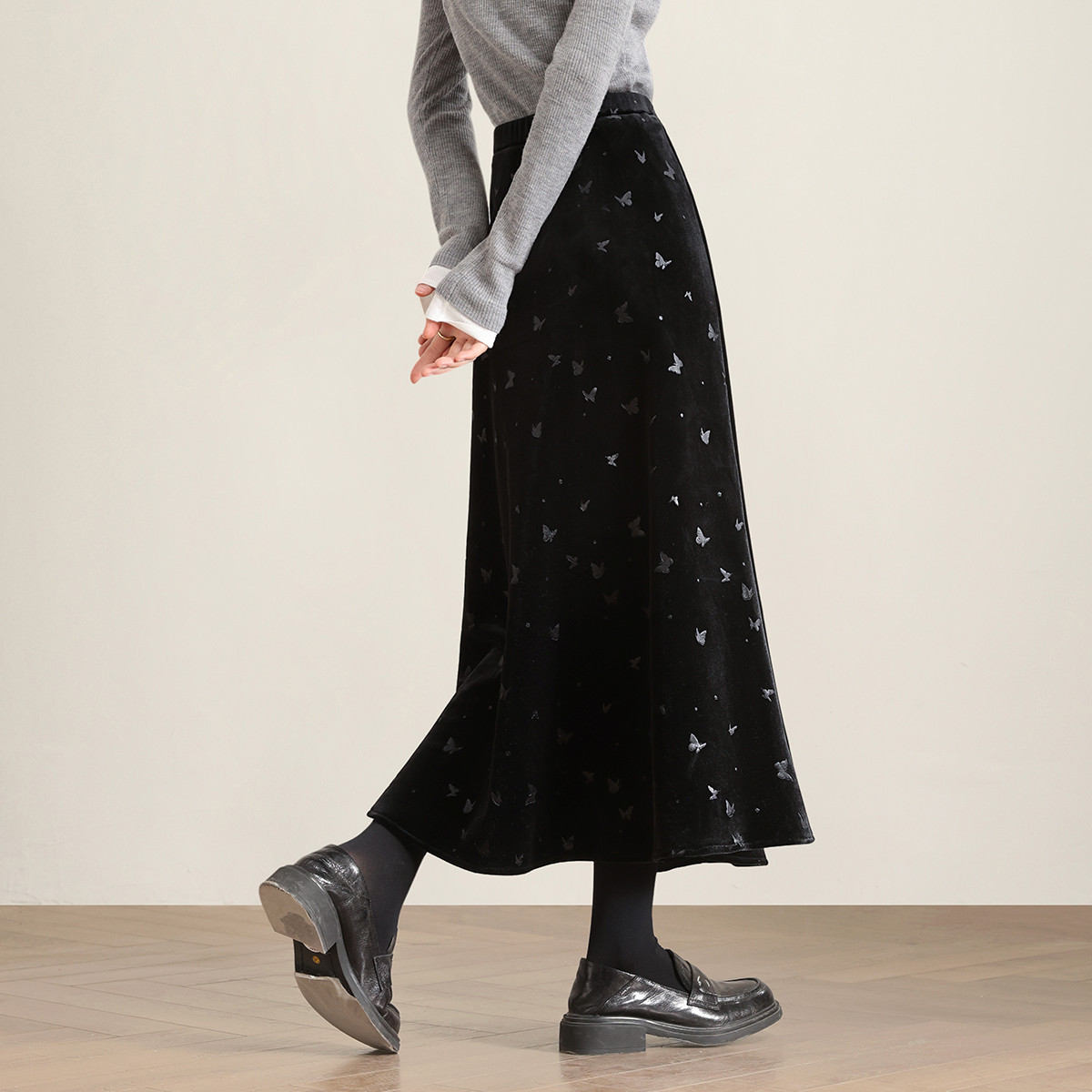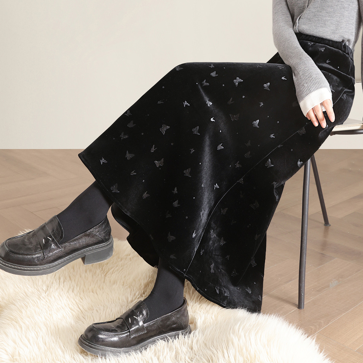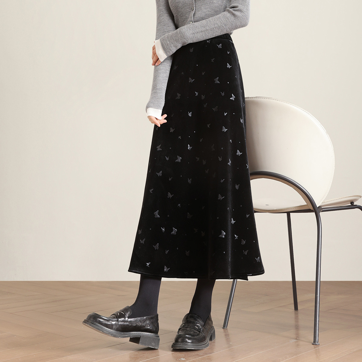 FA49026# 高级感穿搭丝绒蝴蝶中长半身裙加绒a字梨型身材遮胯小个子秋冬裙 服裝批發女裝批發服飾貨源