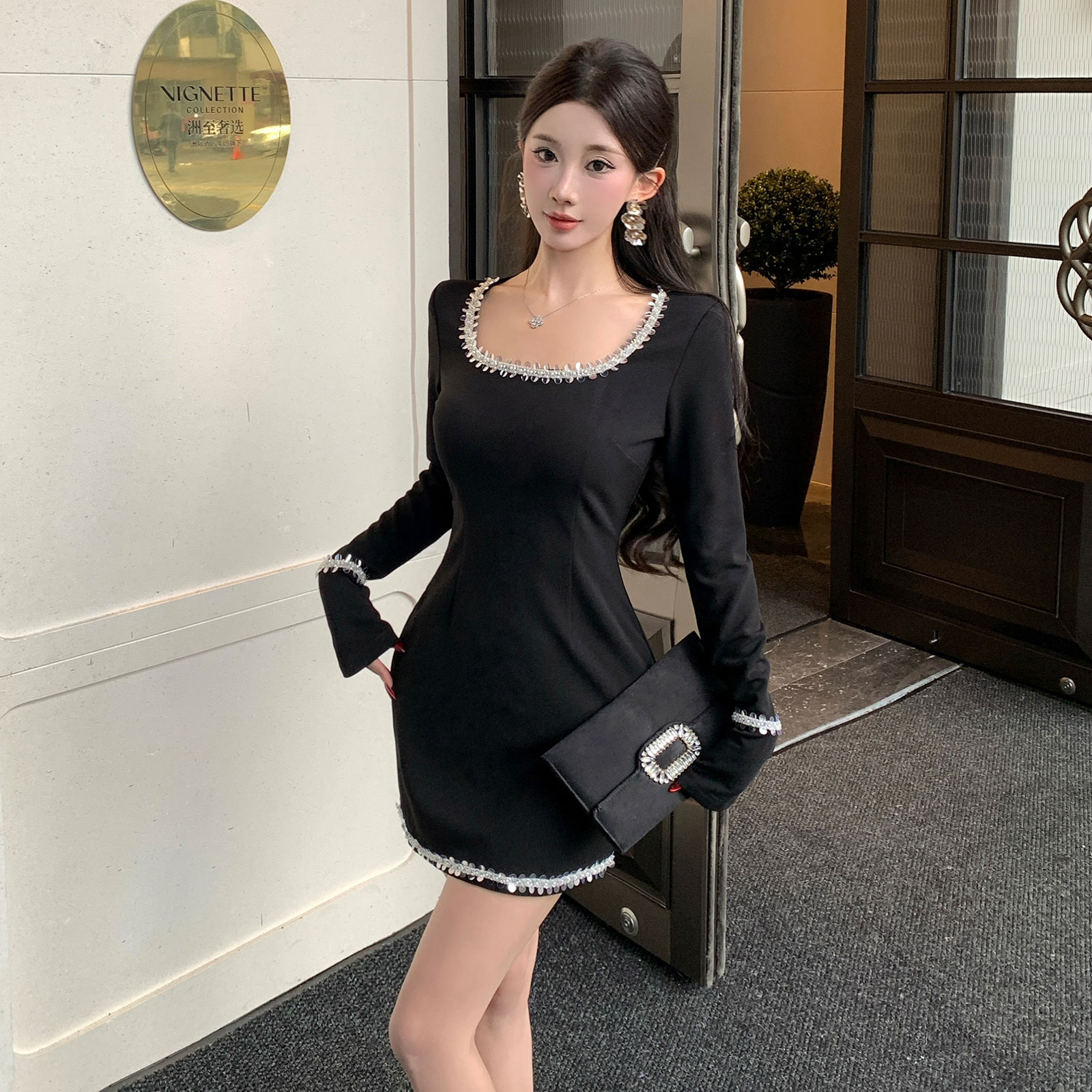 FA49055# 秋冬小黑裙长袖重工钉珠高级感法式收腰修身连衣裙生日小礼裙 服裝批發女裝批發服飾貨源