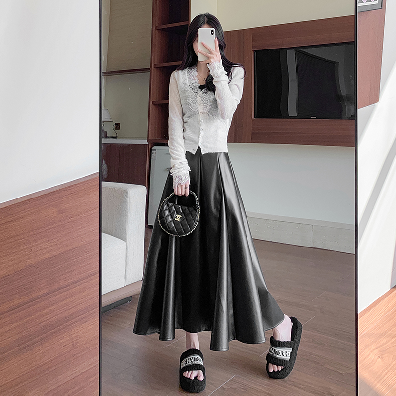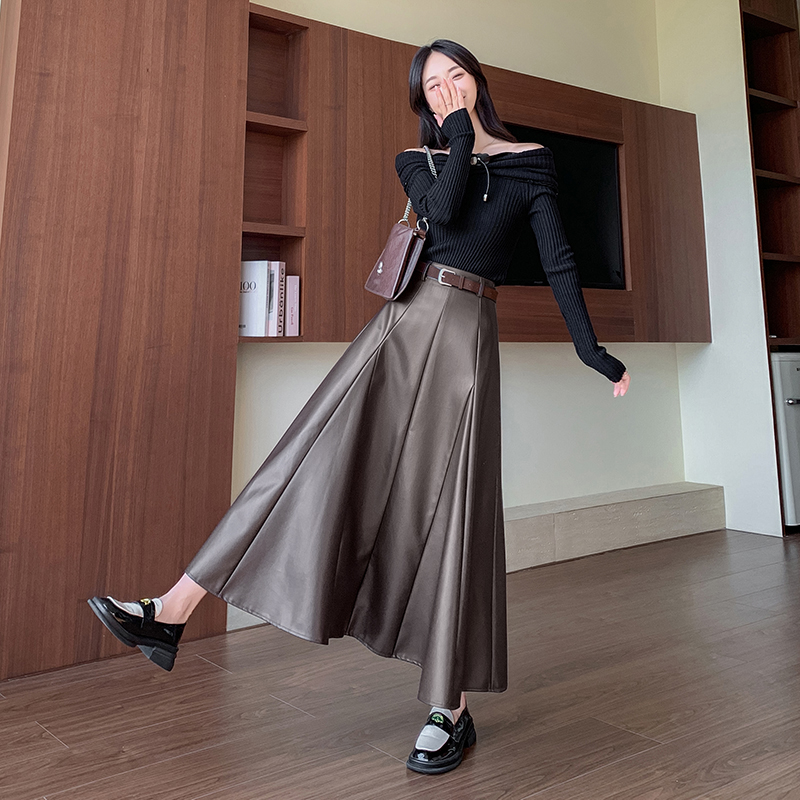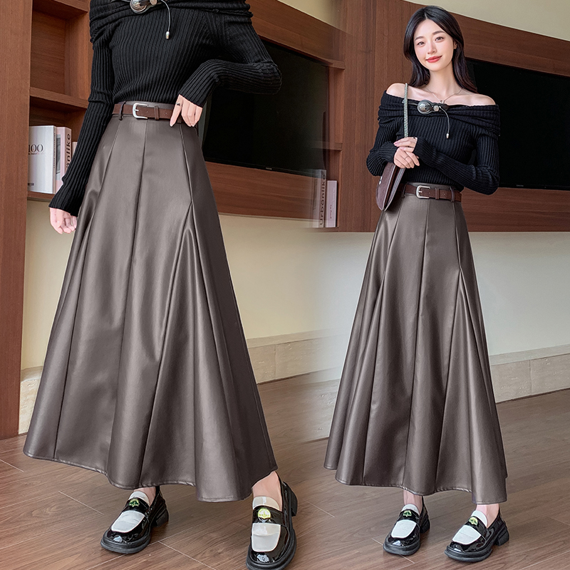 FA49074# PU皮半身裙女秋冬新款百搭大摆皮裙中长a字裙遮胯显瘦皮长裙 服裝批發女裝批發服飾貨源