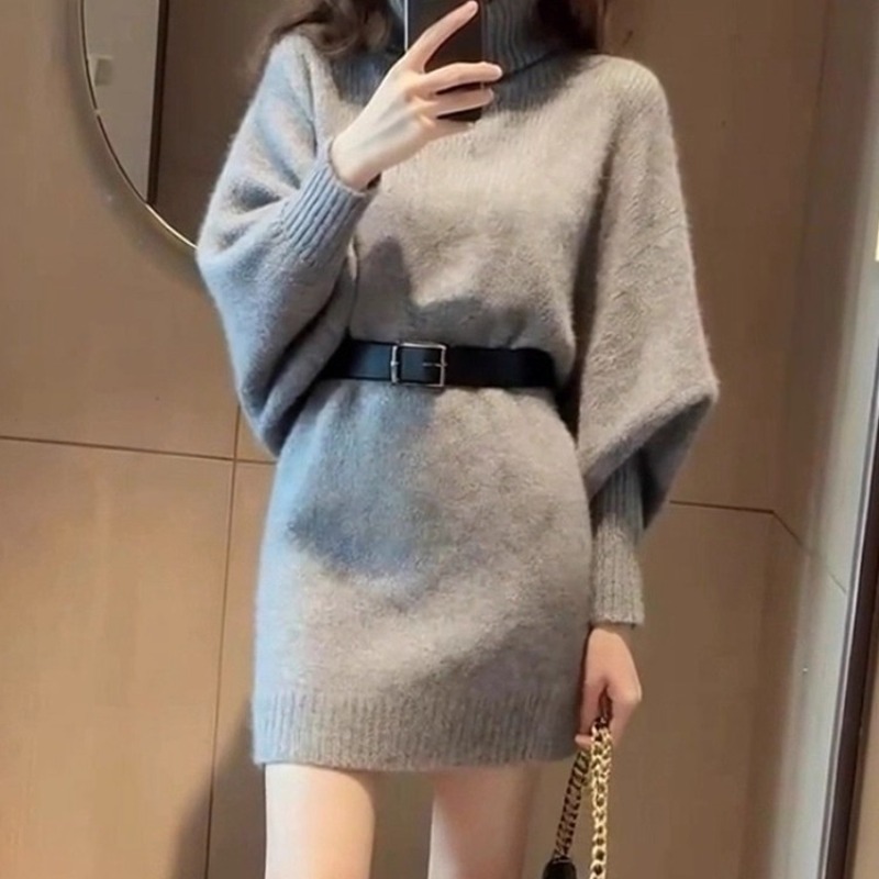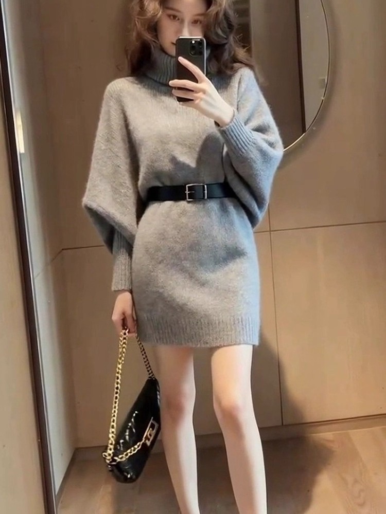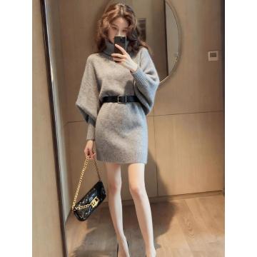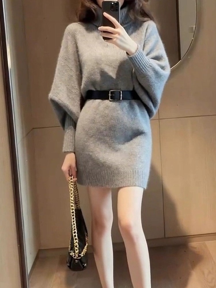 FA49227# 出席重要场合的裙子轻熟法式高级感气质收腰灰色高领毛衣连衣裙秋 服裝批發女裝批發服飾貨源