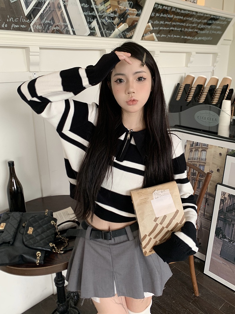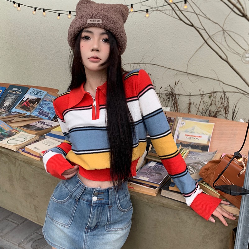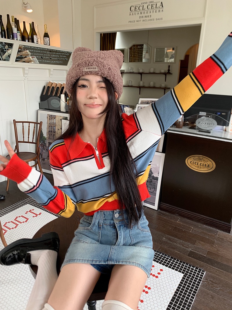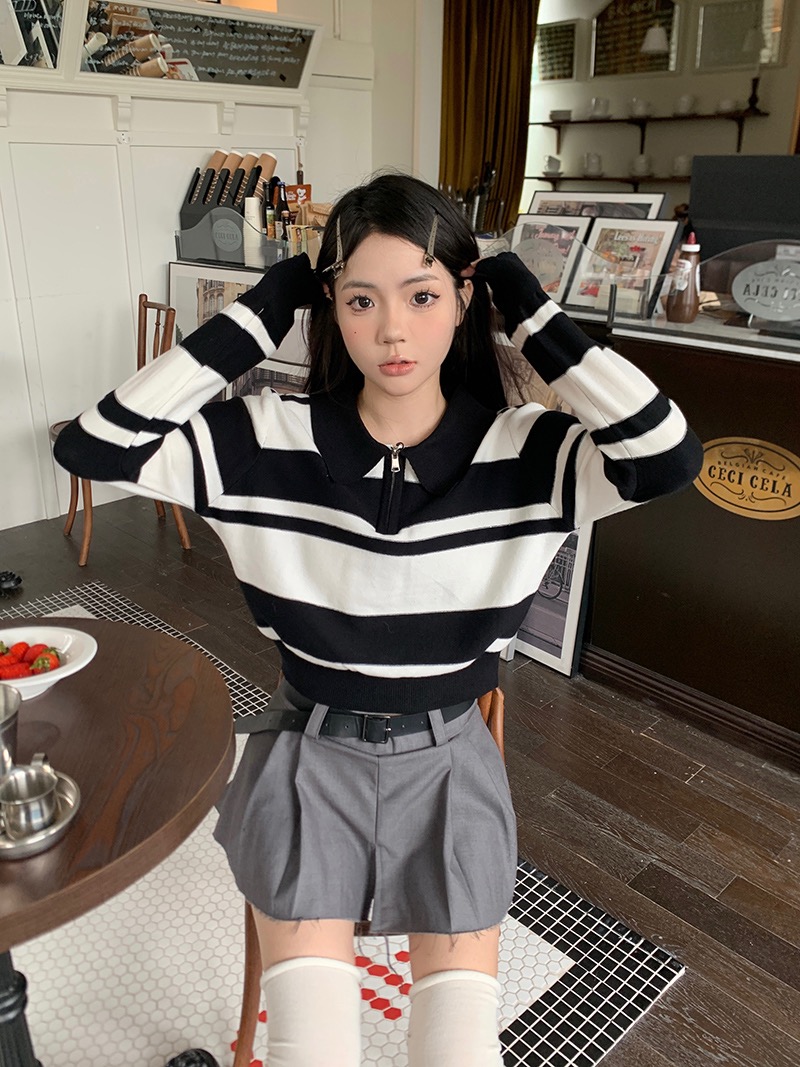FA49281# 拼色条纹polo领长袖针织衫 服裝批發女裝批發服飾貨源