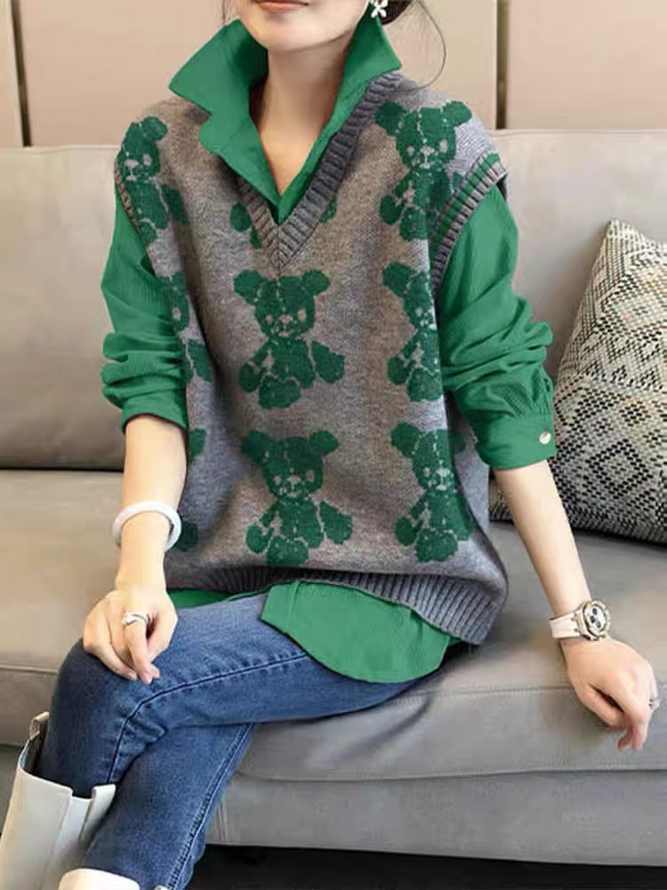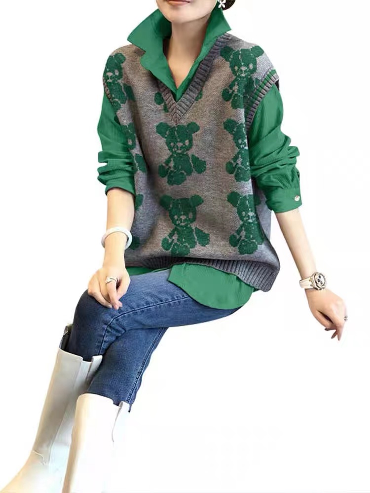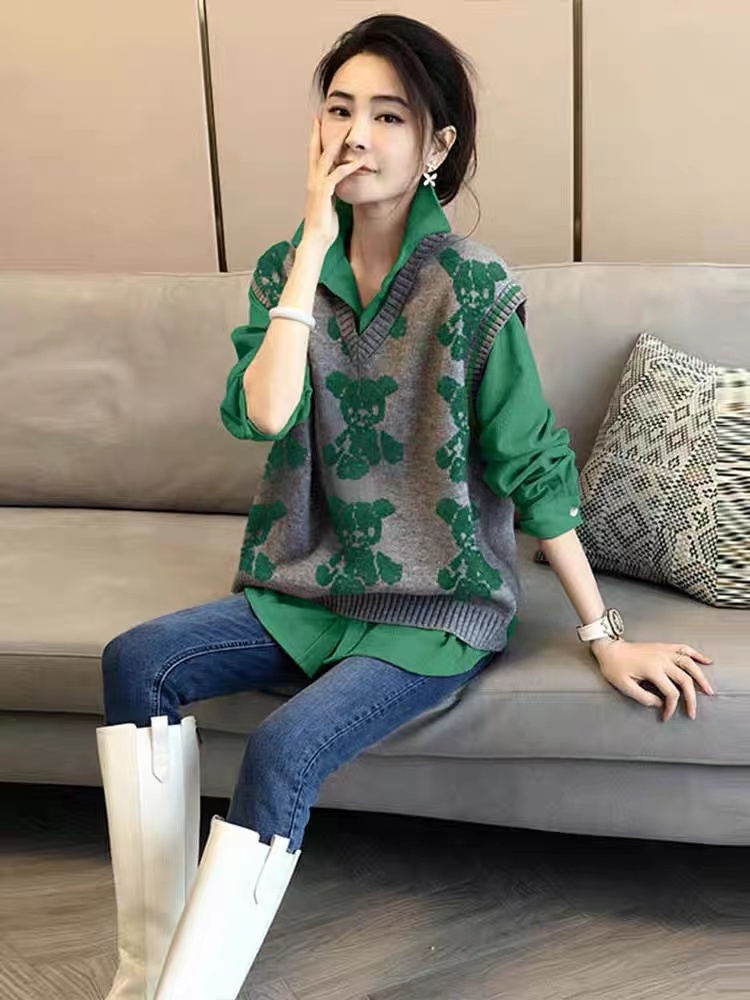 FA49284# 绿色针织马甲长袖衬衫两件套装女时尚洋气秋季新款欧洲站潮 服裝批發女裝批發服飾貨源