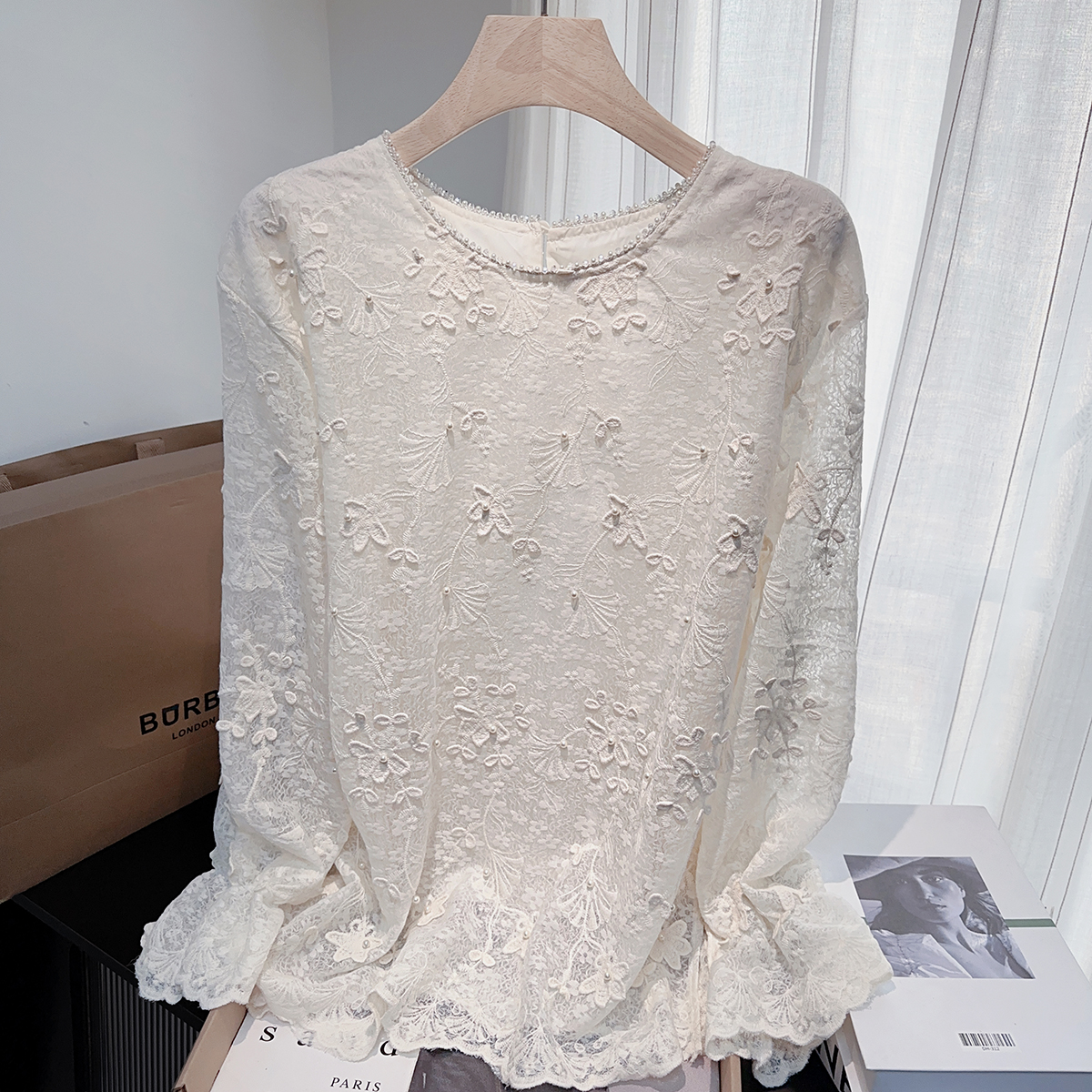 FA49521# 春秋新款蕾丝提花工重高级感衬衫女小众宽松中长款显瘦上衣