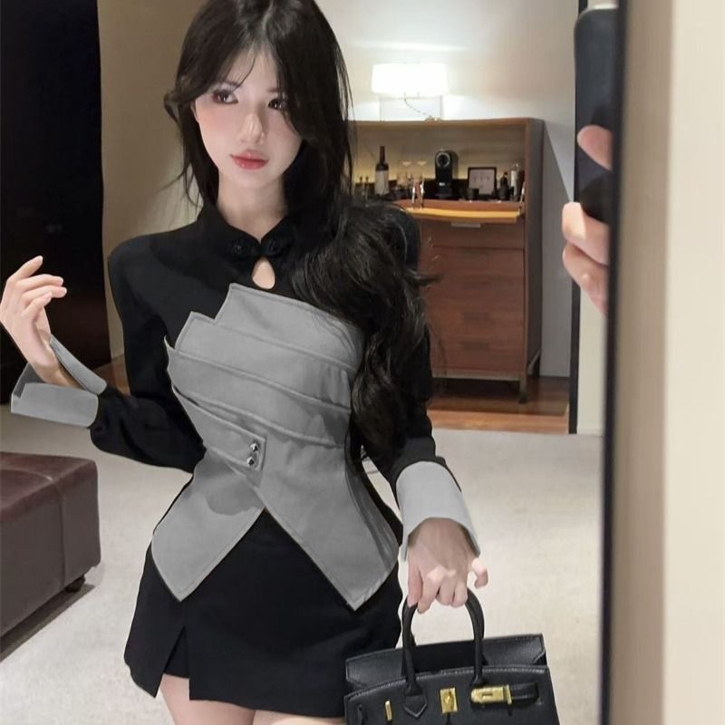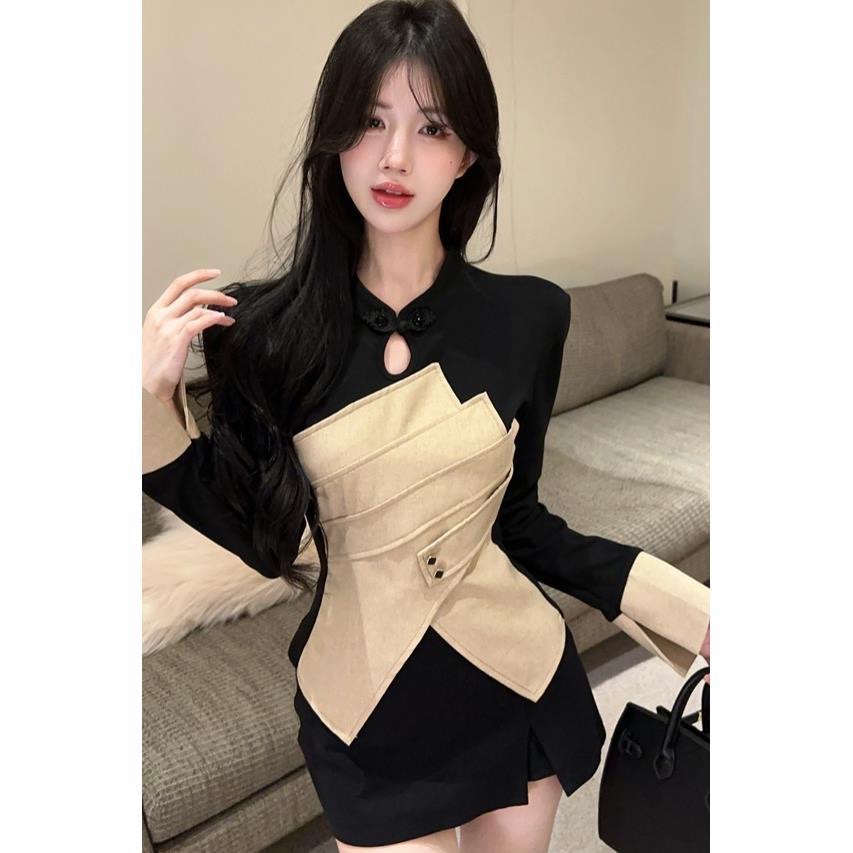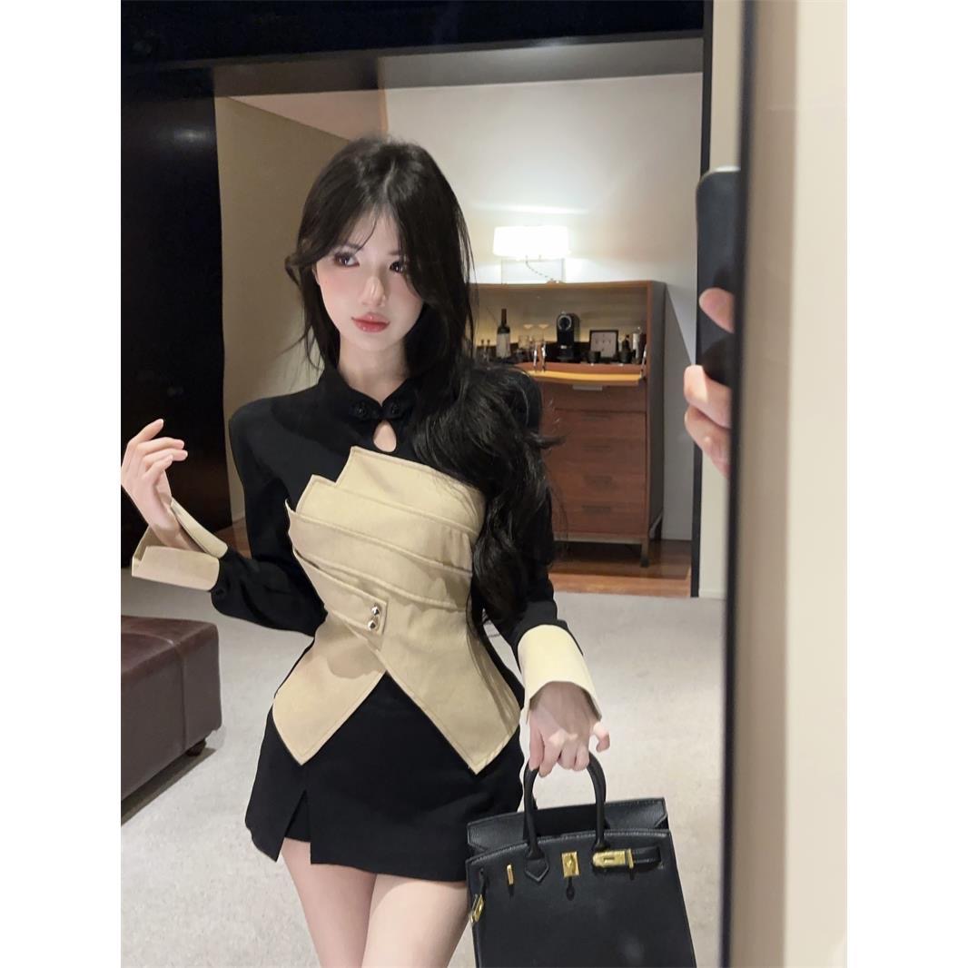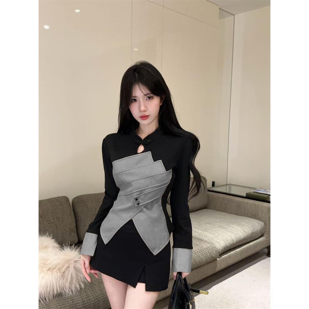 FA49691# 复古洋气镂空撞色开叉长袖T恤打底衫时尚性感气质显瘦套头上衣女