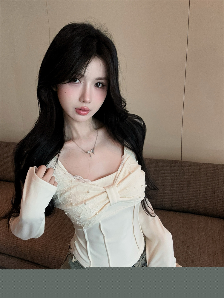 FA49692# 小众辣妹性感法式方领重工钉珠蝴蝶结长袖修身磨毛上衣