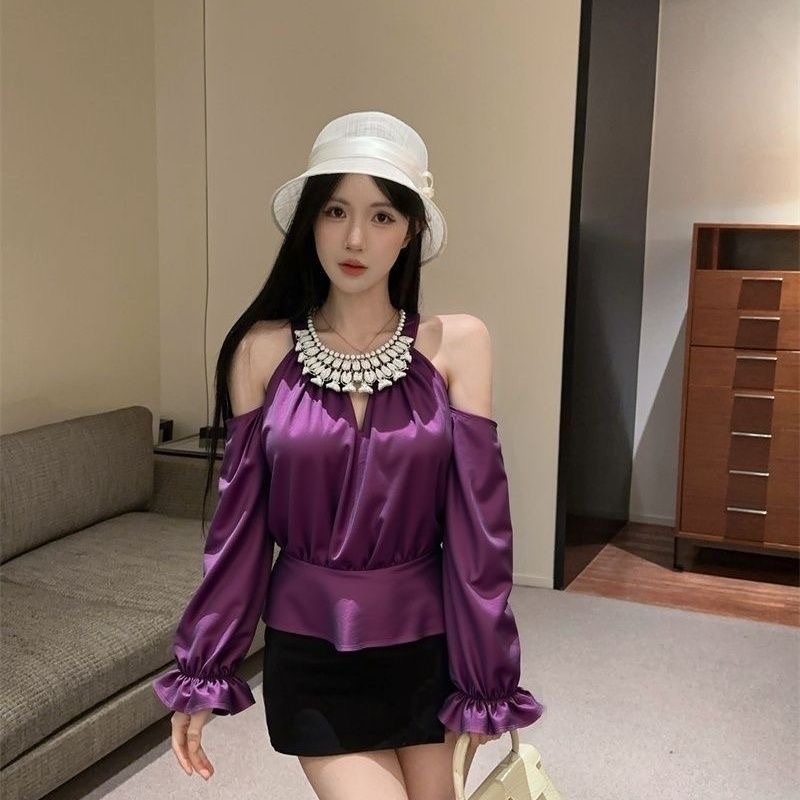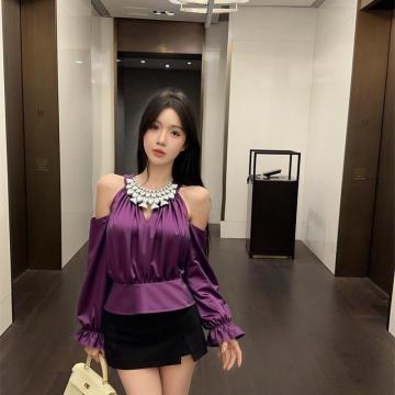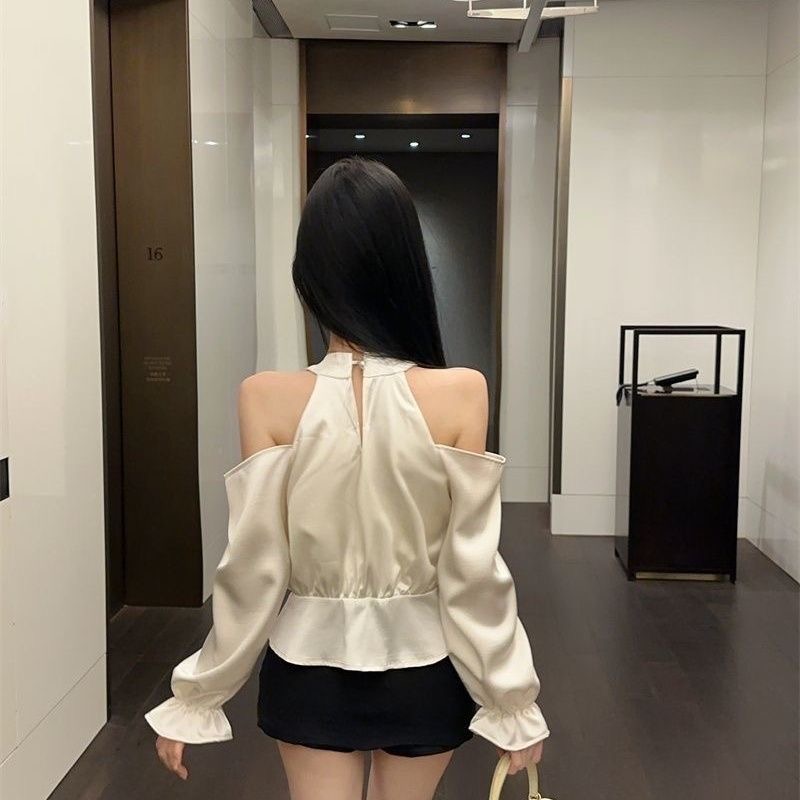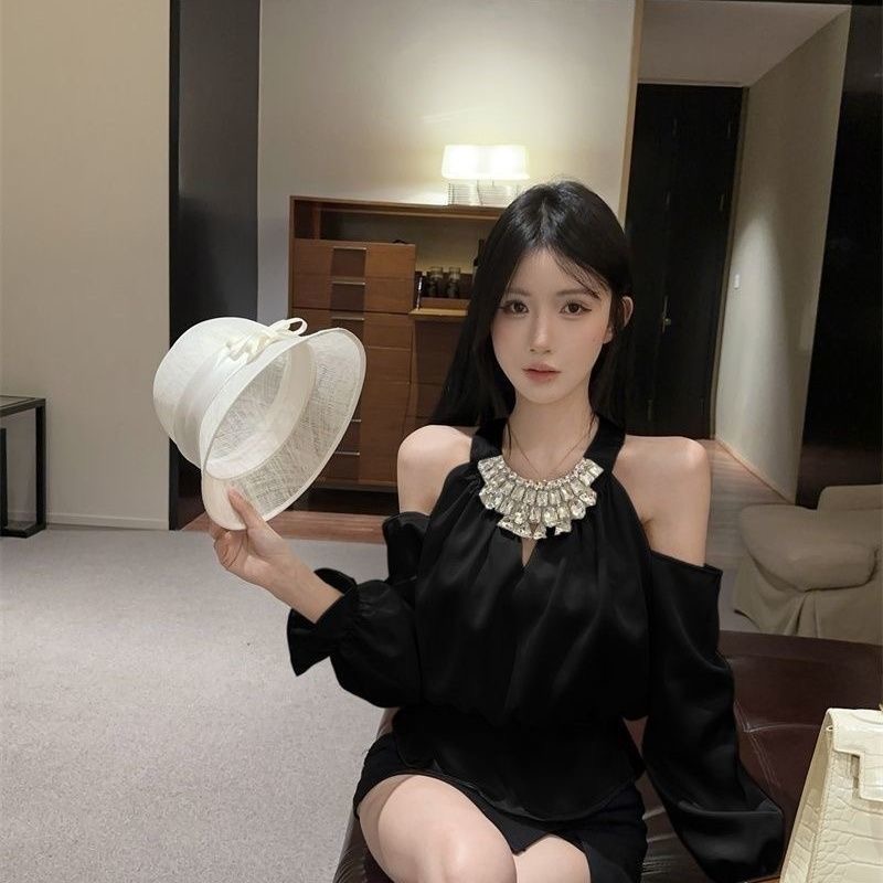 FA49695# 御姐风性感镂空拼接镶钻重工挂脖衬衫女春秋冬季露肩长袖衬衣上衣