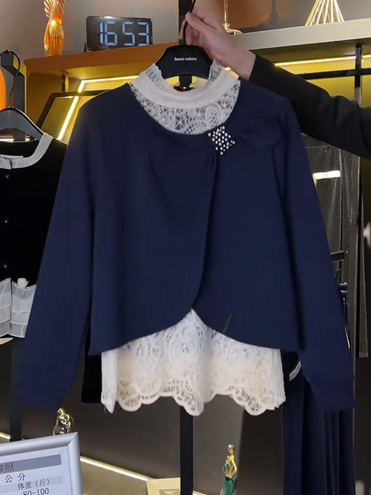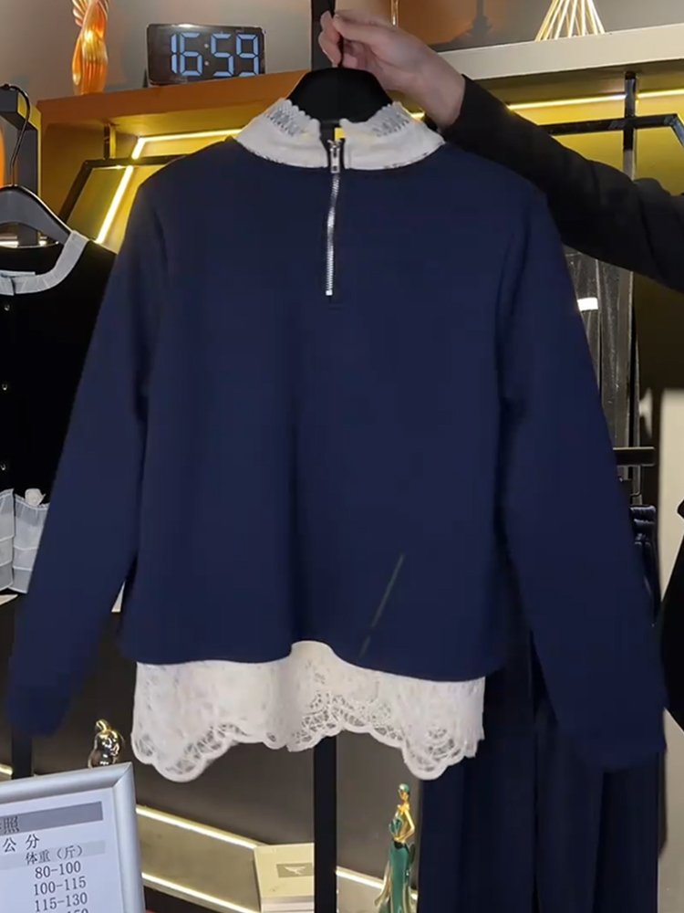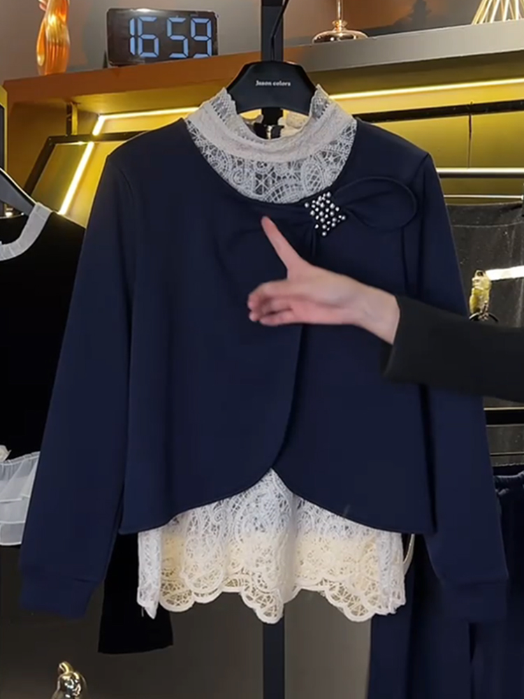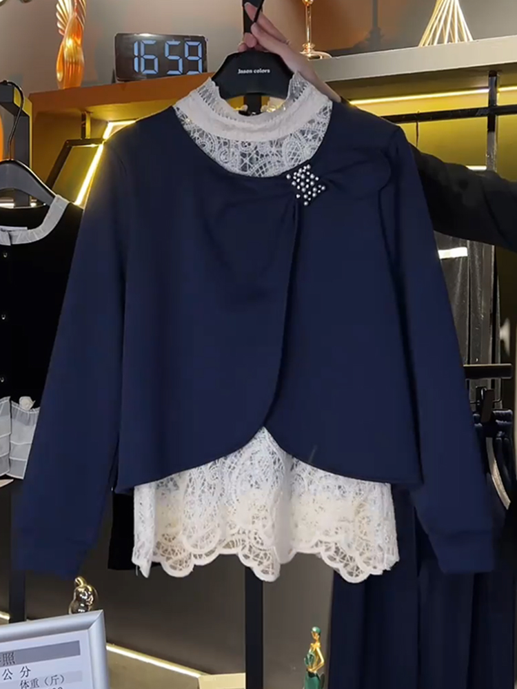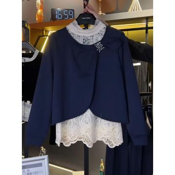 FA49701# 法式蕾丝拼接假两件卫衣女春秋新款韩版时尚百搭钉珠设计上衣
