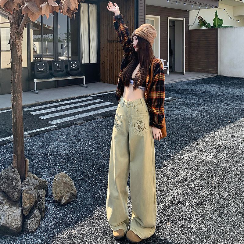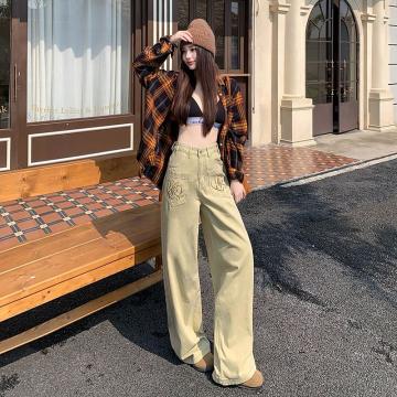 FA49717# 美拉德卡其黑金美式复古绣花牛仔裤拖地裤甜辣女新款宽松阔腿裤