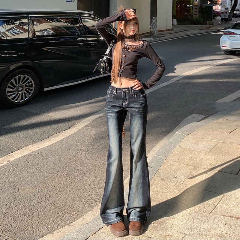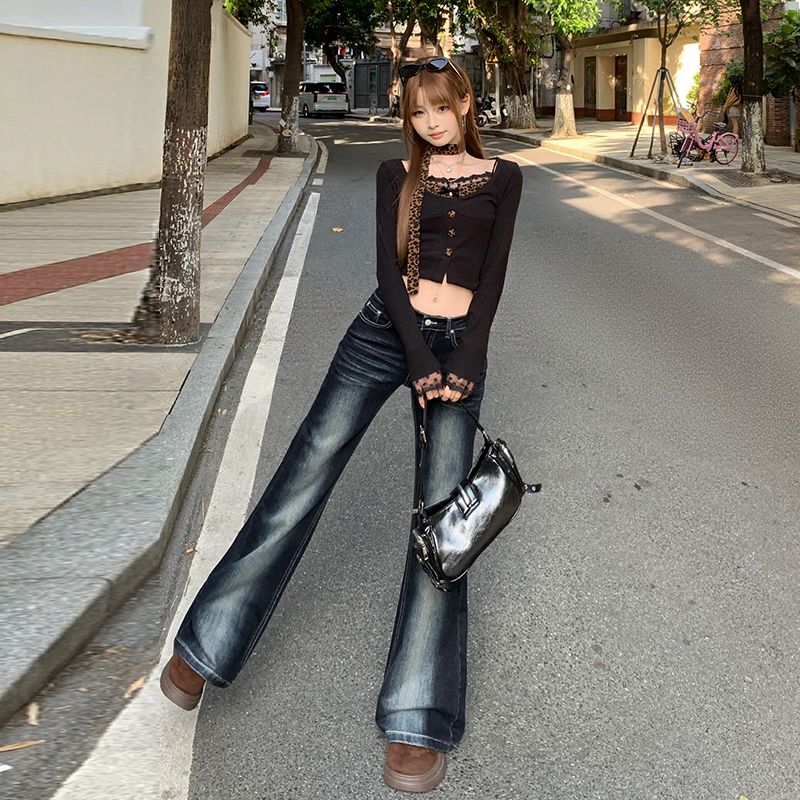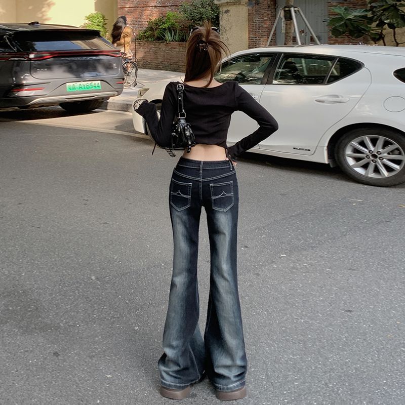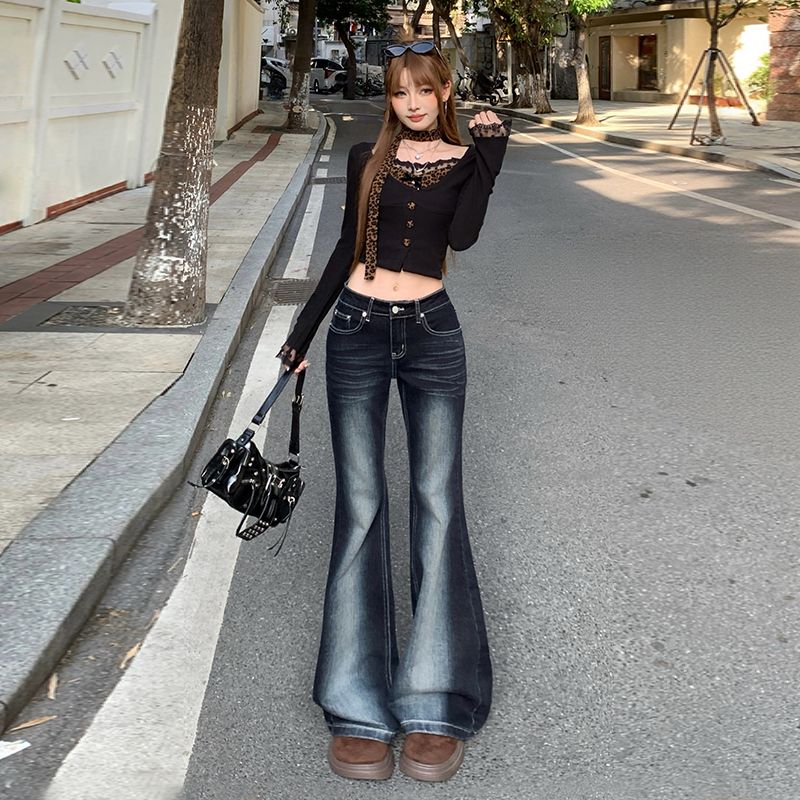 FA49718# 蓝灰美式中低腰微喇牛仔裤女弹力宽松不贴腿个性擦白显瘦拖地裤
