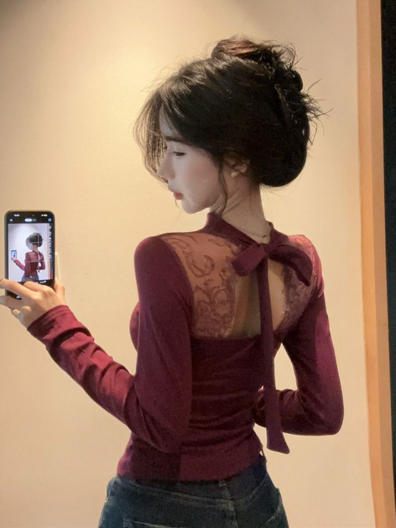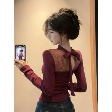 FA49721# 人棉磨毛黑色蕾丝拼接挂脖v领针织衫女气质长袖修身打底衫上衣