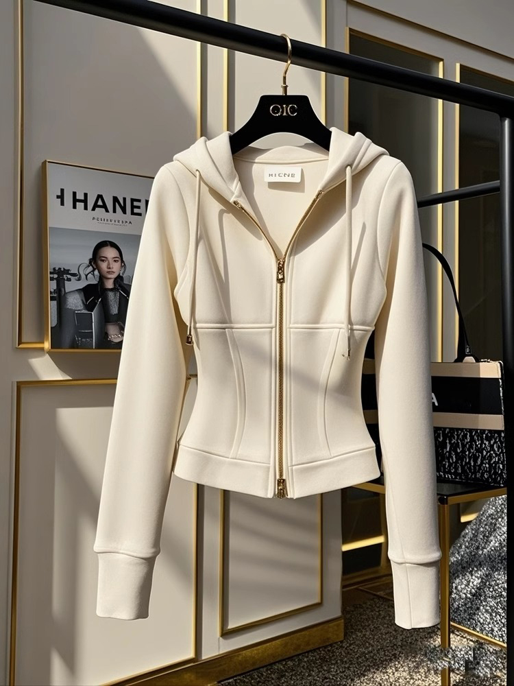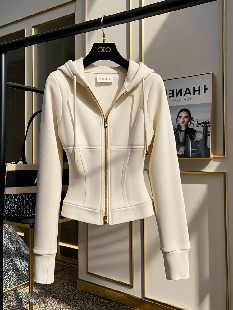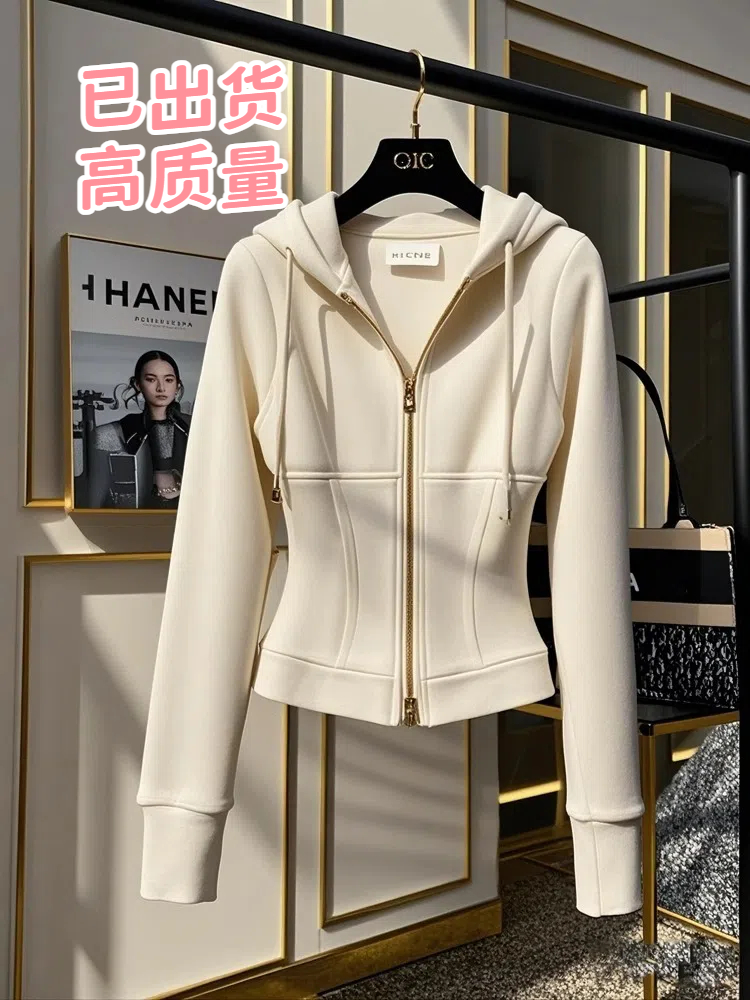 FA49727# 秋冬独特别致加绒加厚连帽卫衣女外套设计感小众收腰拉链长袖上衣