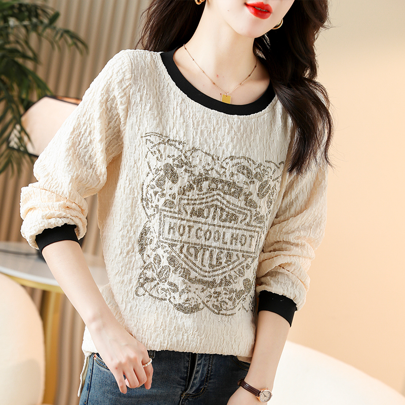 FA49733# 秋季撞色烫钻长袖T恤上衣宽松大码胖妹妹女欧洲站新款