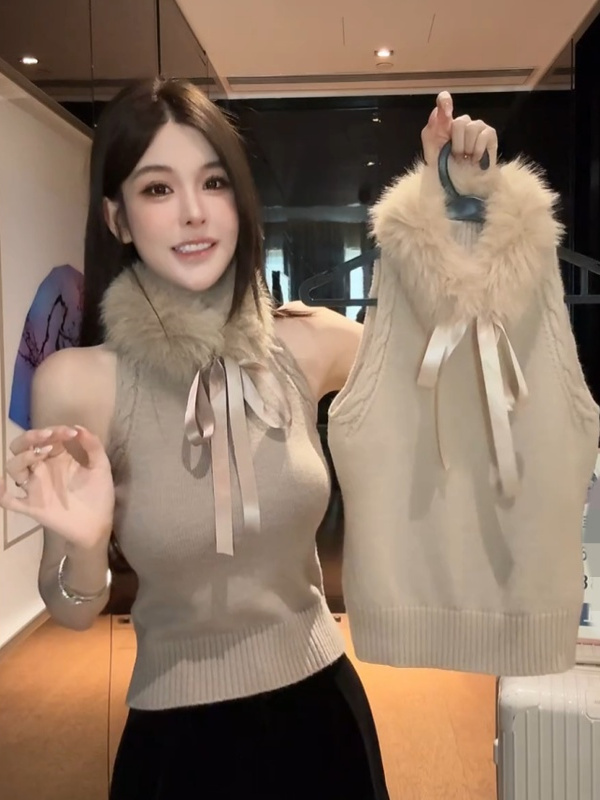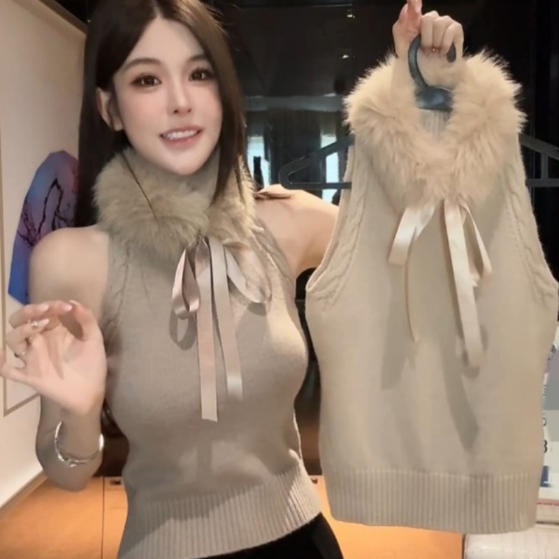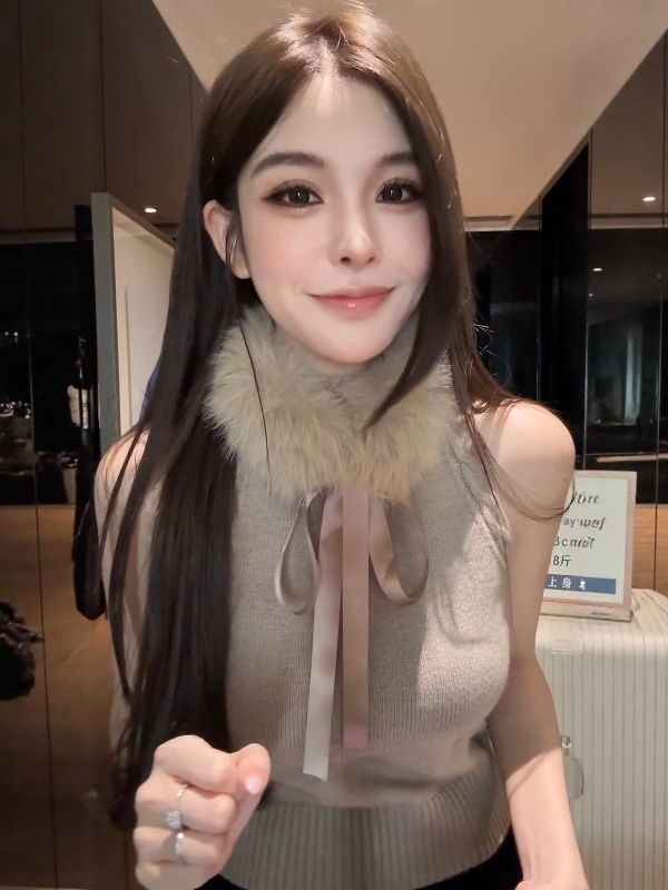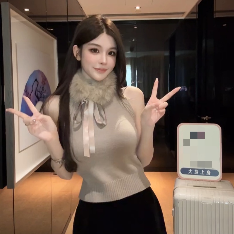 FA49734# 御姐风挂脖毛领针织无袖背心女秋冬新款显瘦气质温柔气质内搭上衣