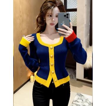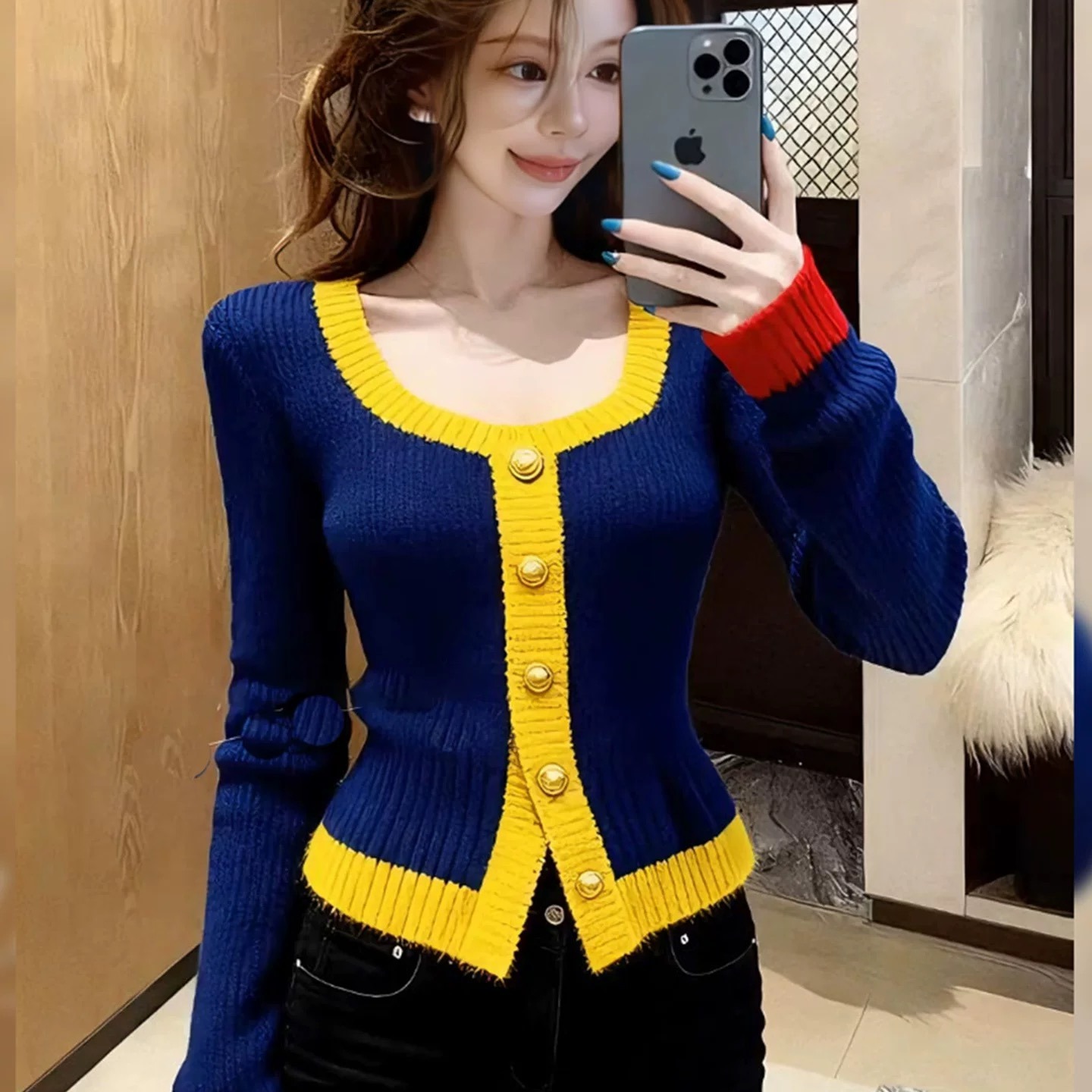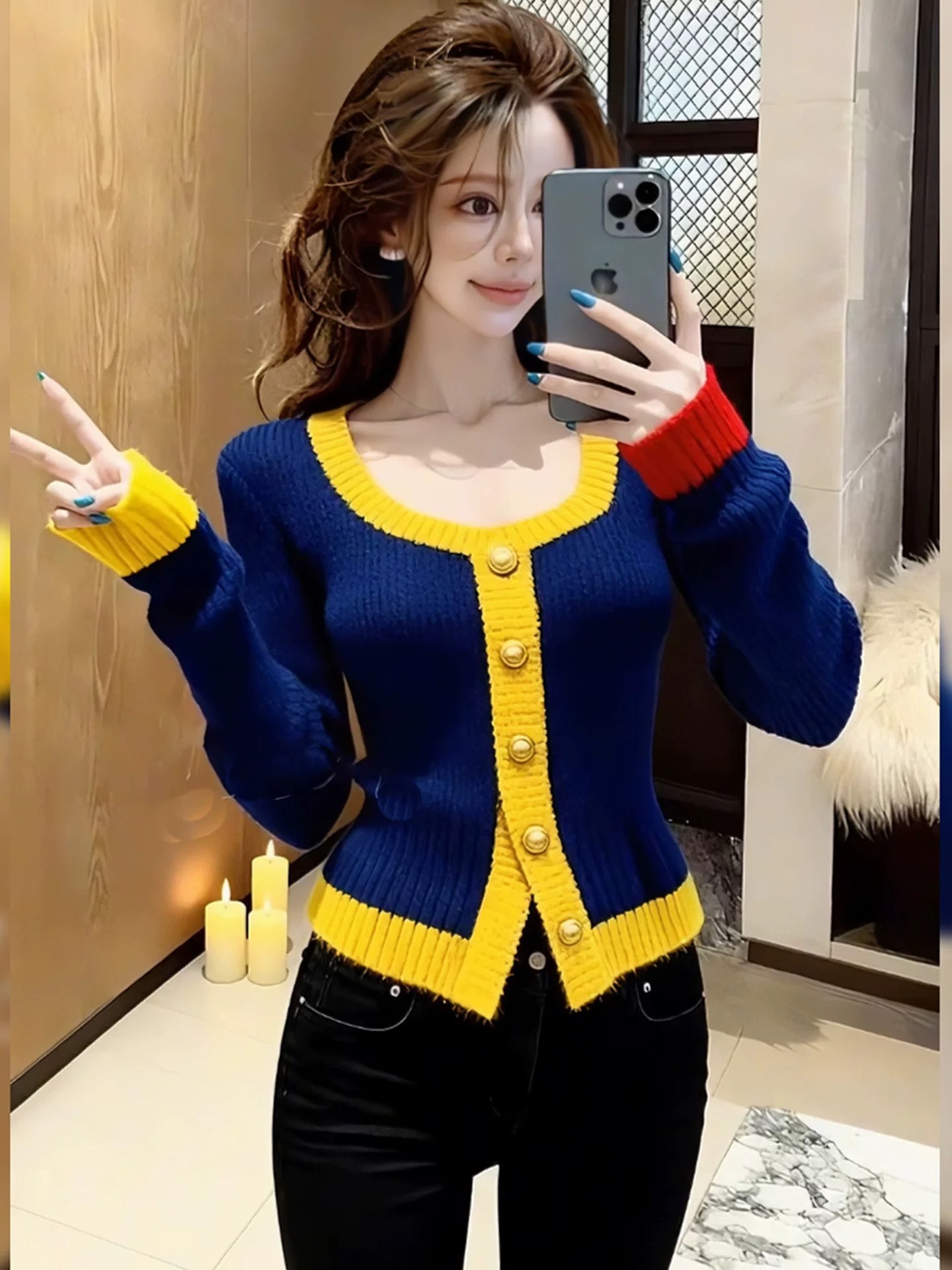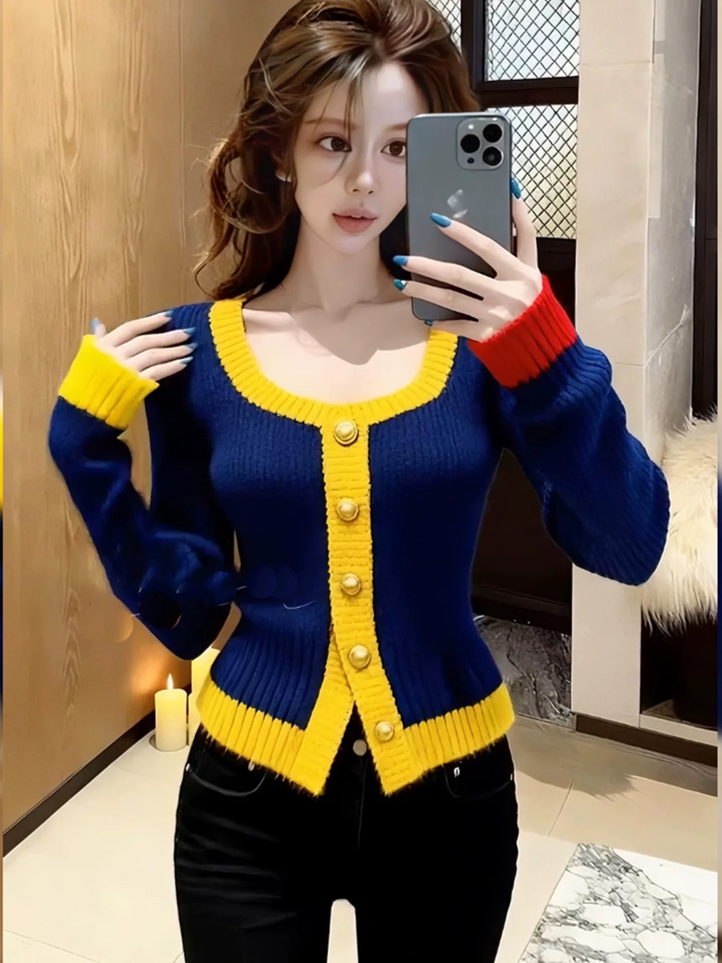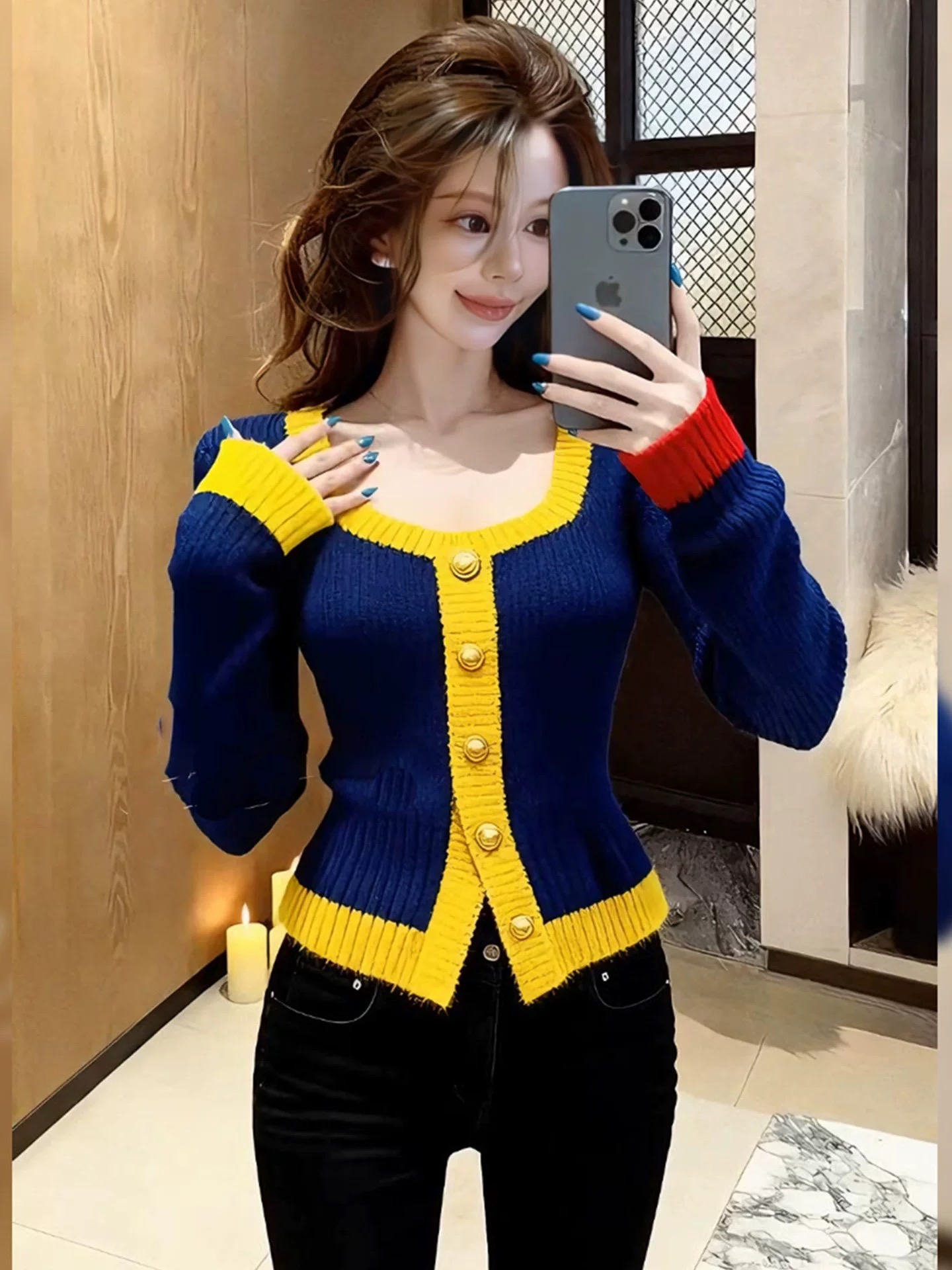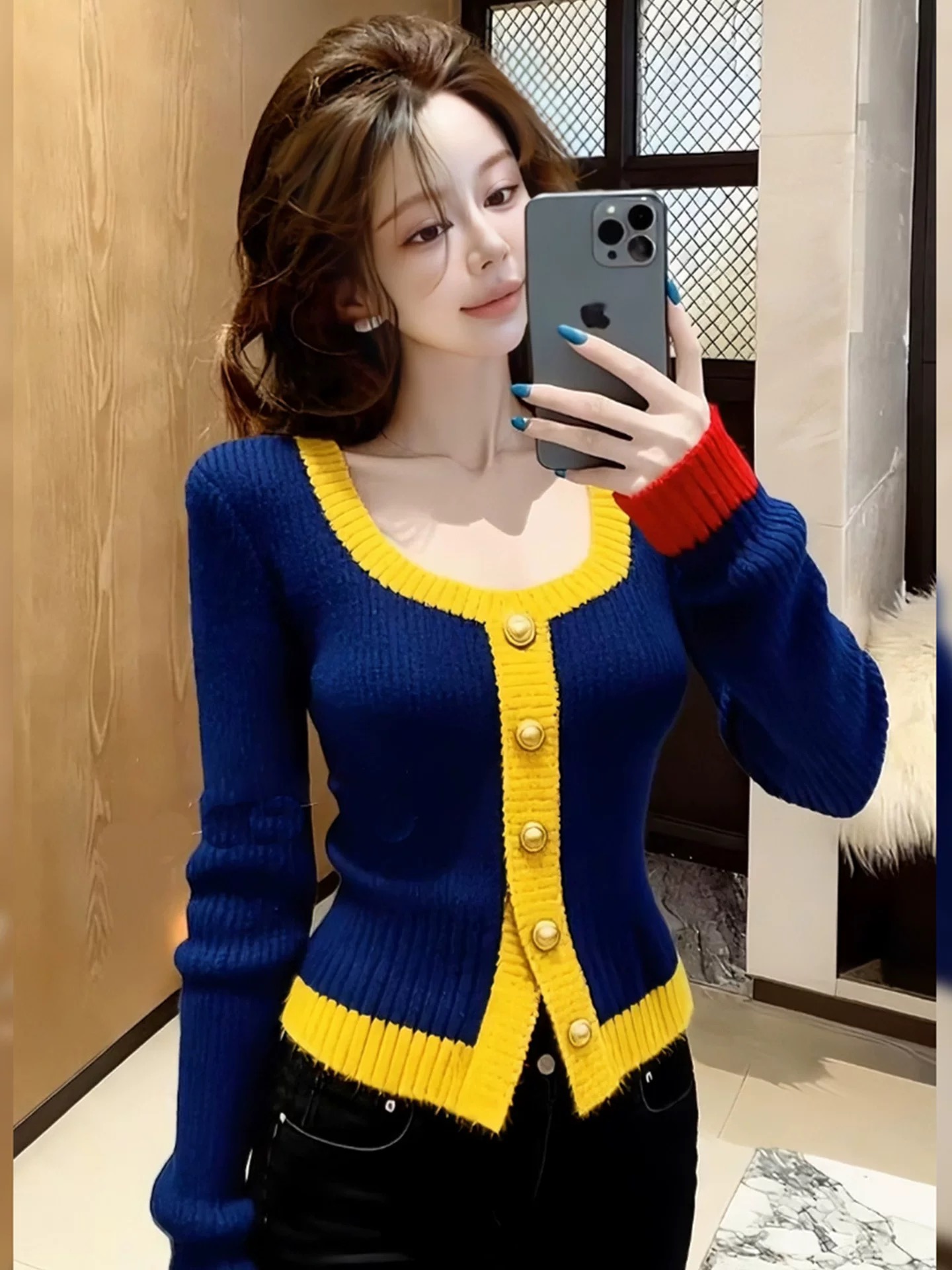 FA49740# 方领短款长袖修身内搭针织打底衫新款蓝色轻奢上衣女装