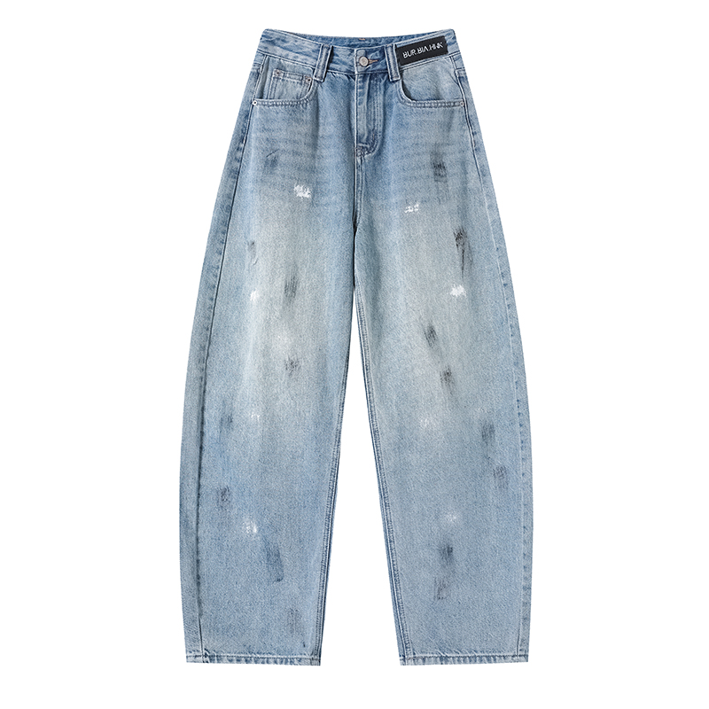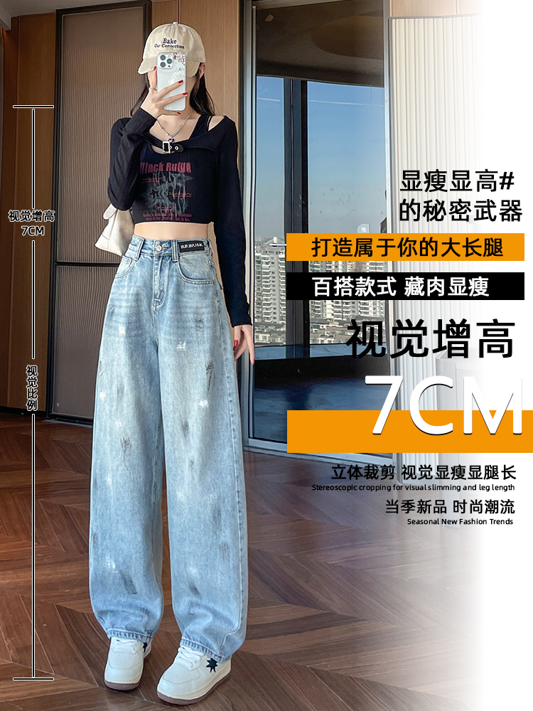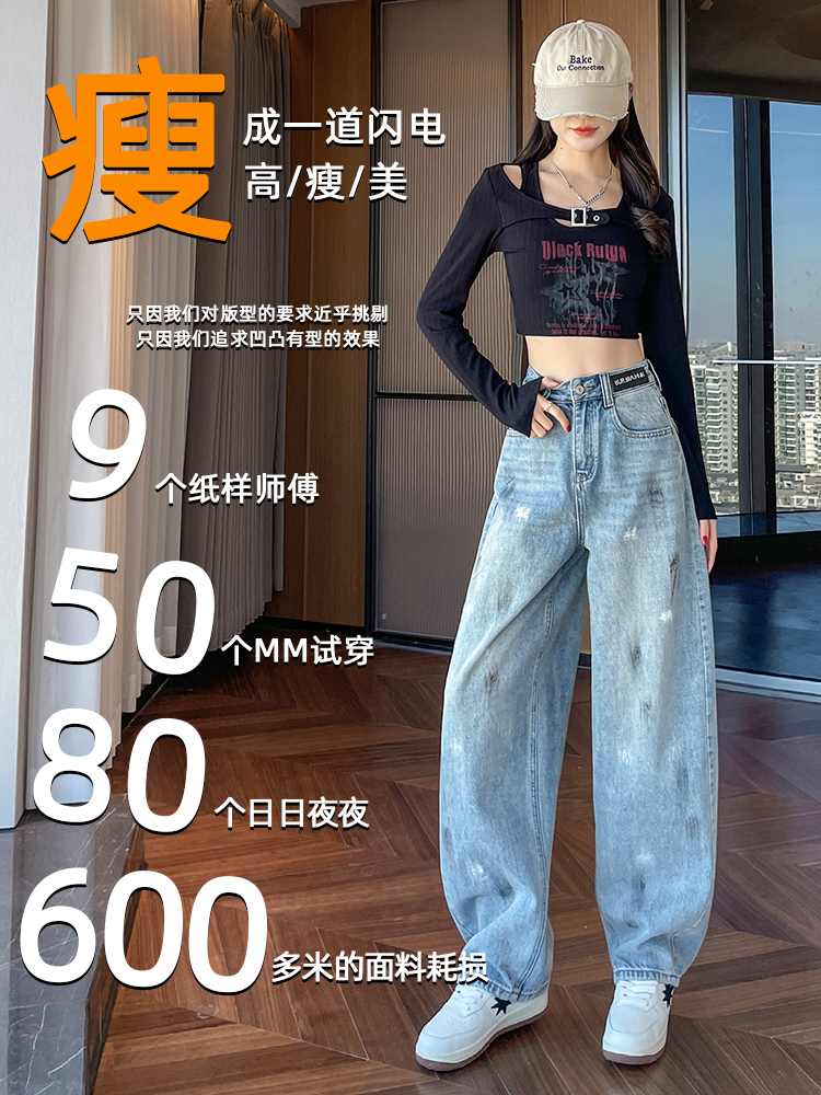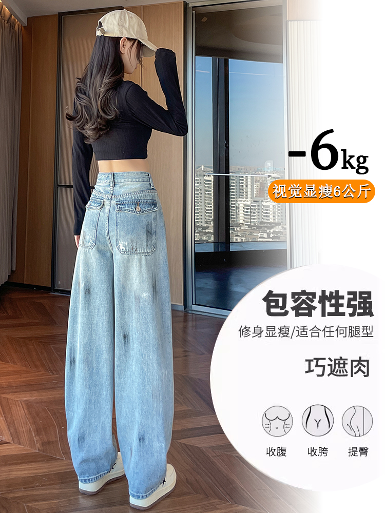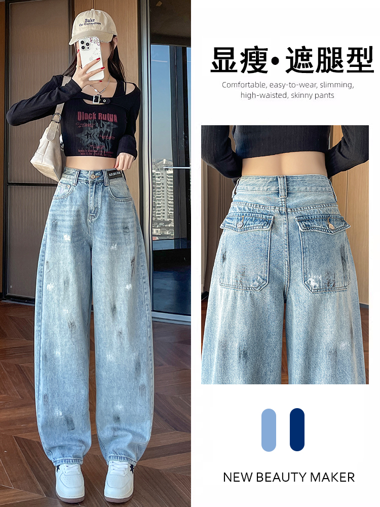 FA53616# 复古弯刀牛仔裤女春季新款高腰显瘦宽松设计感涂鸦阔腿裤