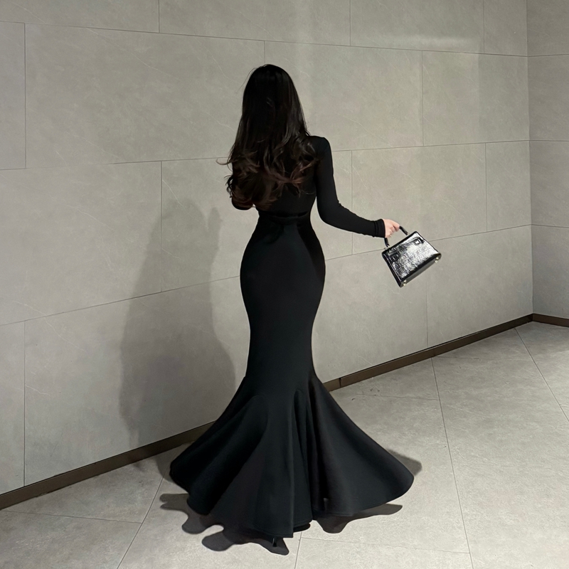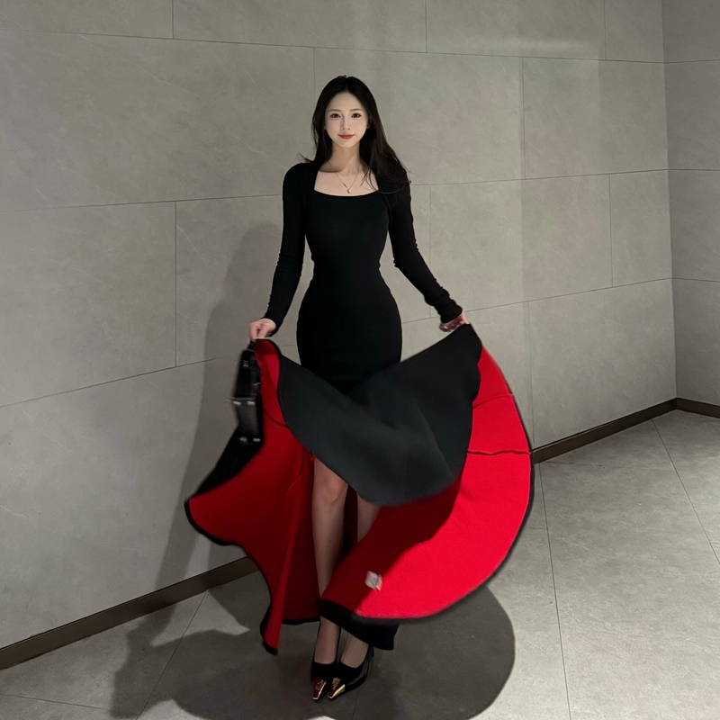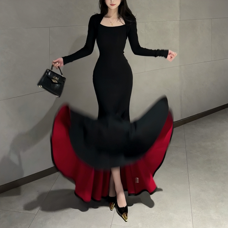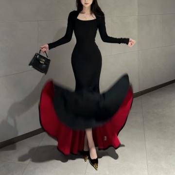 FA53702# 红底加厚复合绒秋冬步步生莲方领显瘦百搭包臀鱼尾裙气质长裙