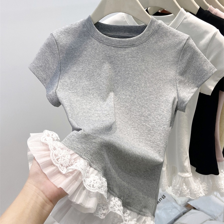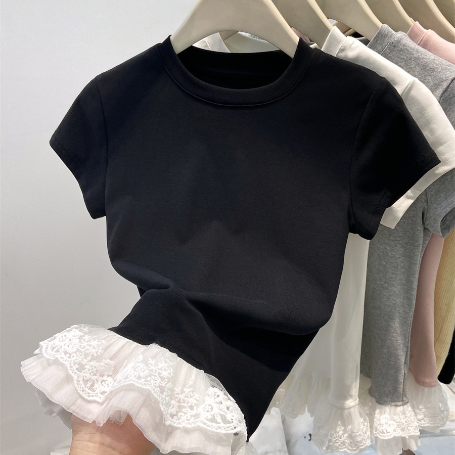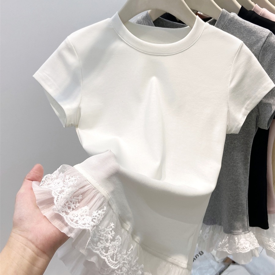 FA54596# 白色纯欲甜美蕾丝花边正肩短袖T恤女夏辣妹修身 服裝批發女裝批發服飾貨源