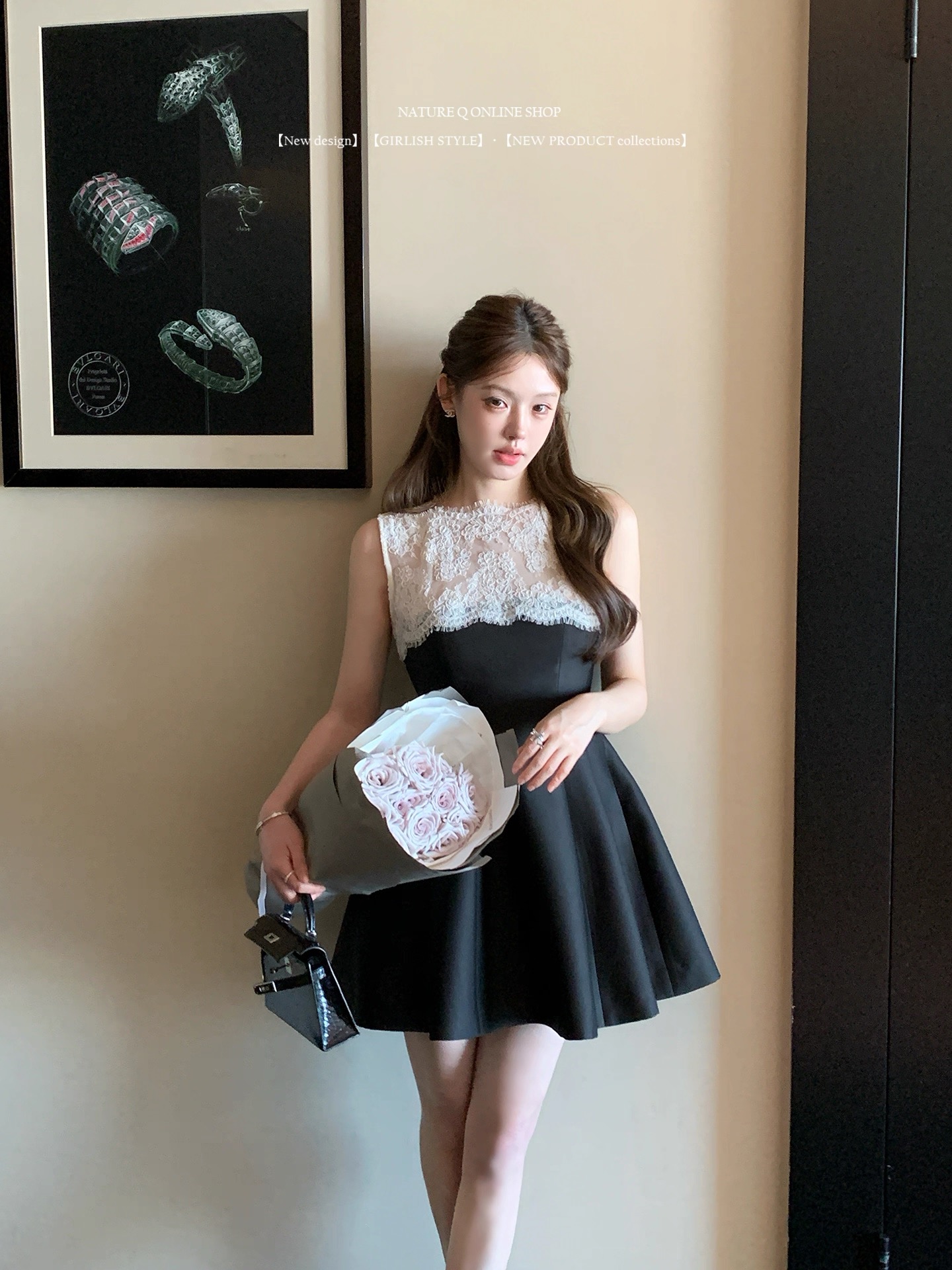 FA54843# 蕾丝拼接无袖小黑裙连衣裙 服裝批發女裝批發服飾貨源