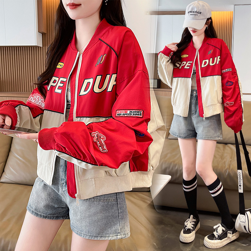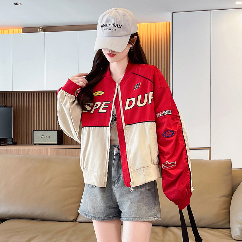 FA54938# 高端春季机车夹克女百搭撞色外套女立领短款刺绣字母外搭棒球服 服裝批發女裝批發服飾貨源