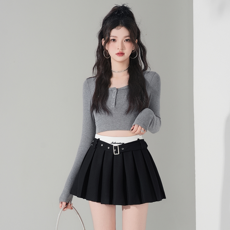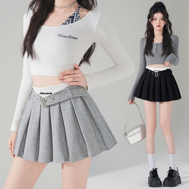 FA55249# 刺绣字母撞色高腰半身裙时尚百褶裙防走光百搭短裙a字裙 服裝批發女裝批發服飾貨源