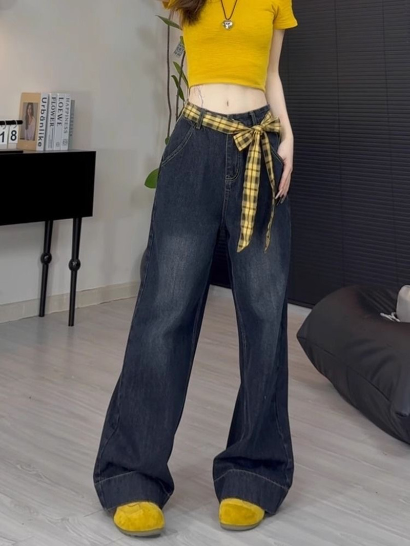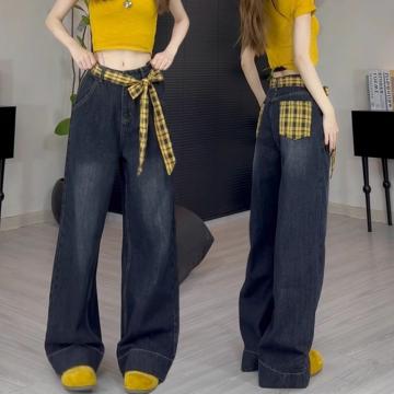 FA55263# 美式复古蓝灰色格子拼接阔腿牛仔裤女春装新款高腰宽松直筒裤 服裝批發女裝批發服飾貨源