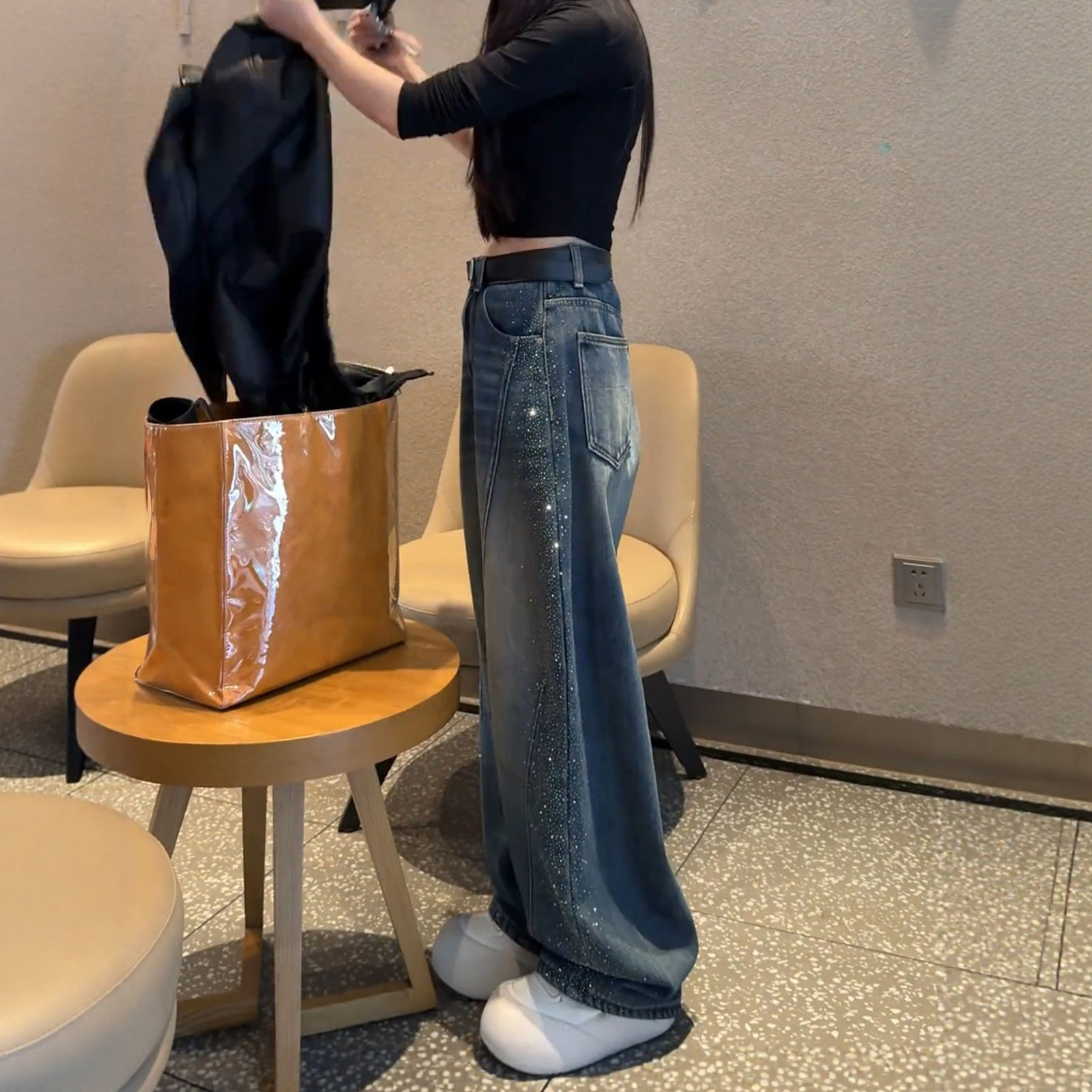 FA55298# 满天星烫钻弯刀牛仔裤女春季新款复古蓝阔腿裤大码胖mm直筒裤 服裝批發女裝批發服飾貨源