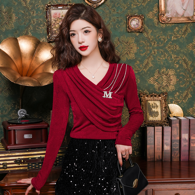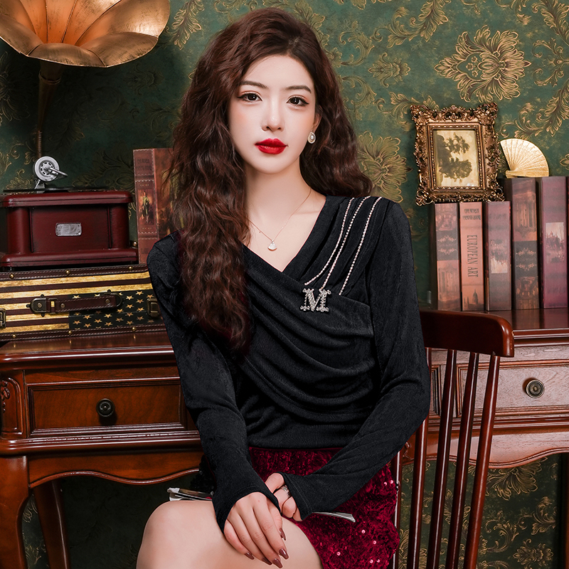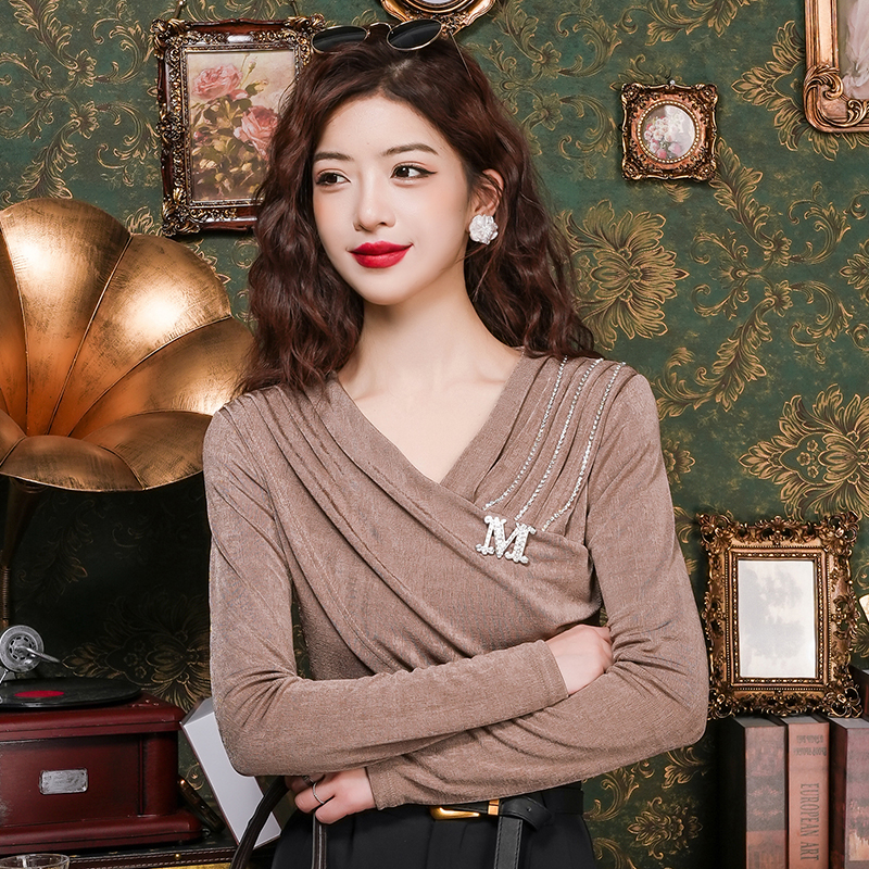 FA55342# 春法式小众打底衫气质v领褶设计感修身显瘦链条挂饰上衣女 服裝批發女裝批發服飾貨源