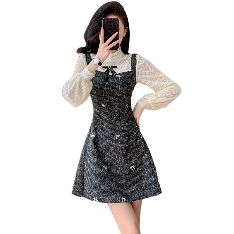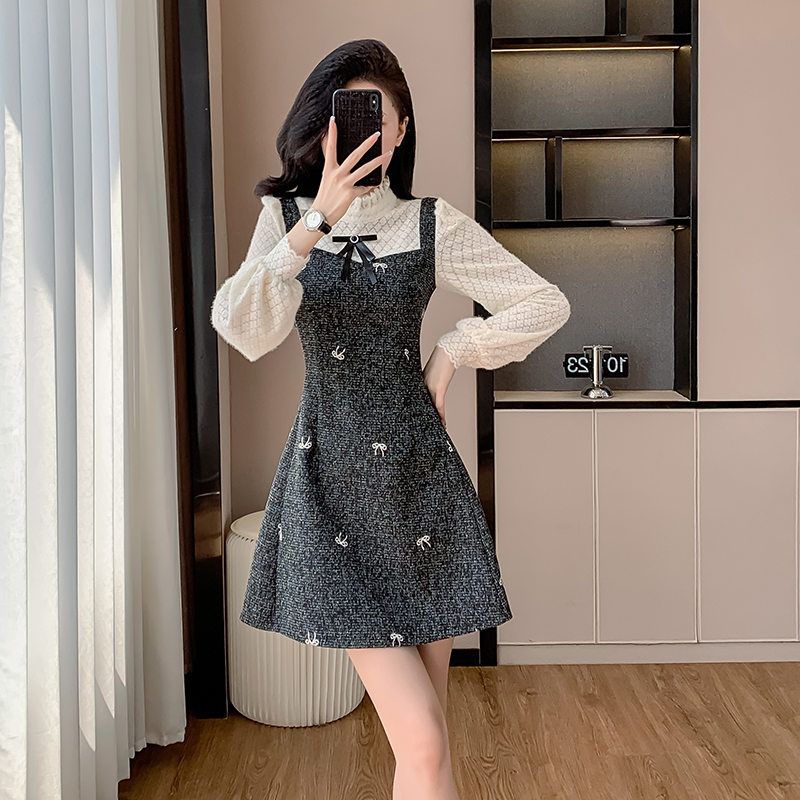 FA55652# 小香风气质甜美假两件连衣裙女春秋季高级感法式收腰a字裙子 服裝批發女裝批發服飾貨源