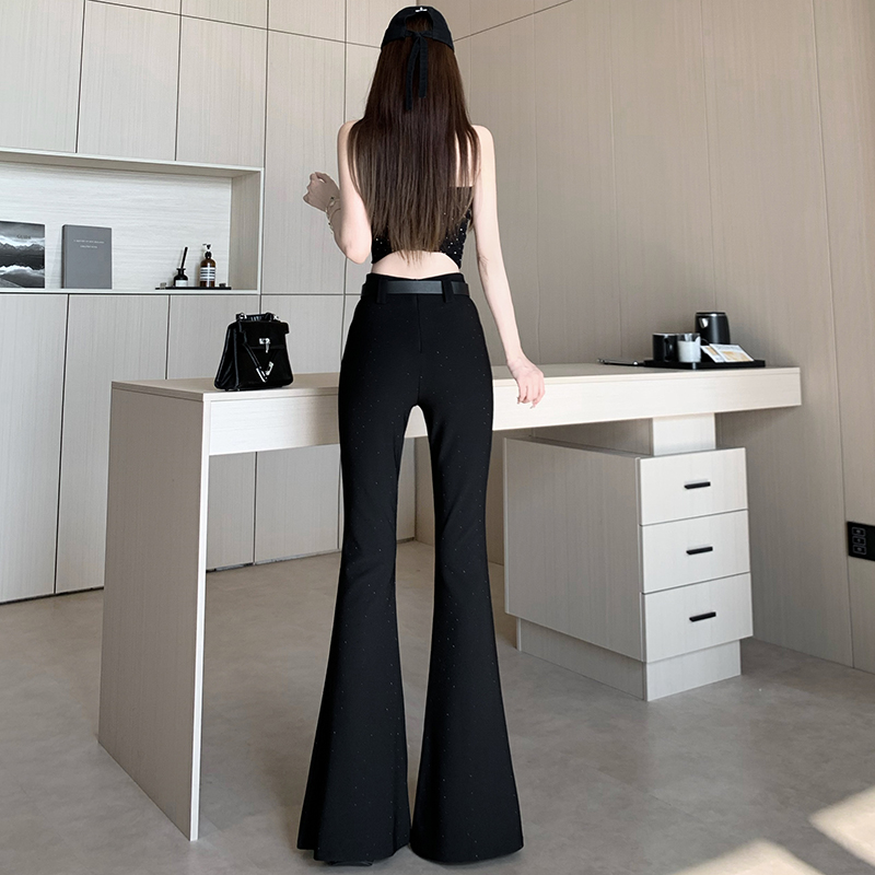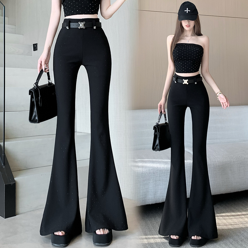 黑色辣妹满天星烫钻微喇休闲裤春季新款高腰修身显高显瘦长裤 服裝批發女裝批發服飾貨源