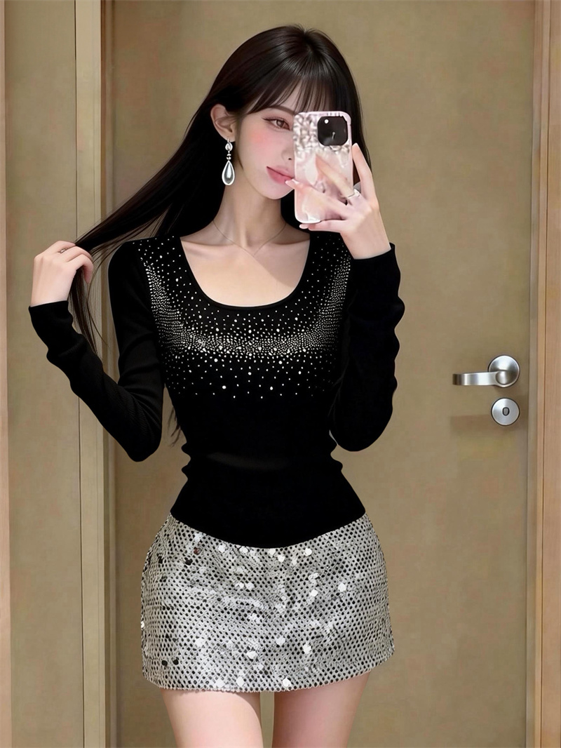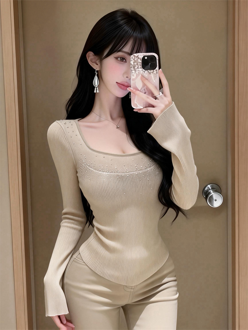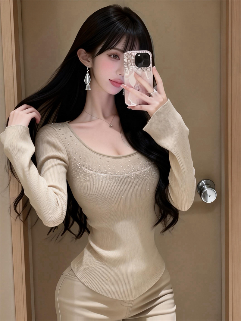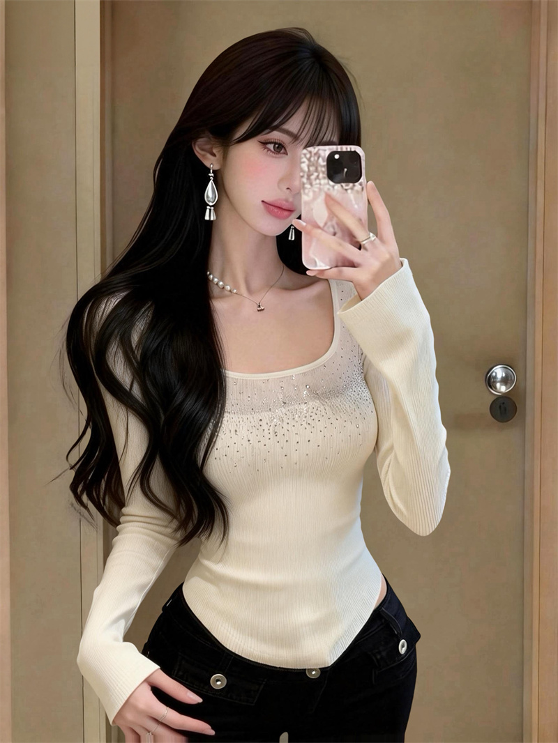 春上新纯欲U领烫钻长袖针织衫女高级感内搭上衣女 服裝批發女裝批發服飾貨源