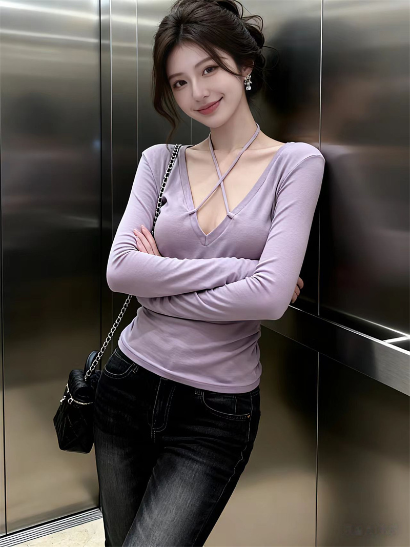 春上新纯欲风深V绑带挂脖长袖打底衫女甜辣内搭T恤上衣 服裝批發女裝批發服飾貨源